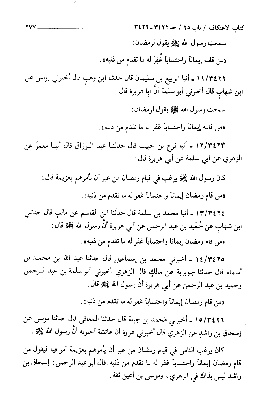 3425 - أخبرني محمد بن إسماعيل قال حدثنا عبد الله بن محمد بن أسماء قال حدثنا جويرية عن مالك قال الزهري أخبرني أبو سلمة بن عبد الرحمن وحميد بن عبد الرحمن عن أبي هريرة أن رسول الله صلى الله عليه و سلم قال : من قام رمضان إيمانا واحتسابا غفر له ما تقدم من ذنبه