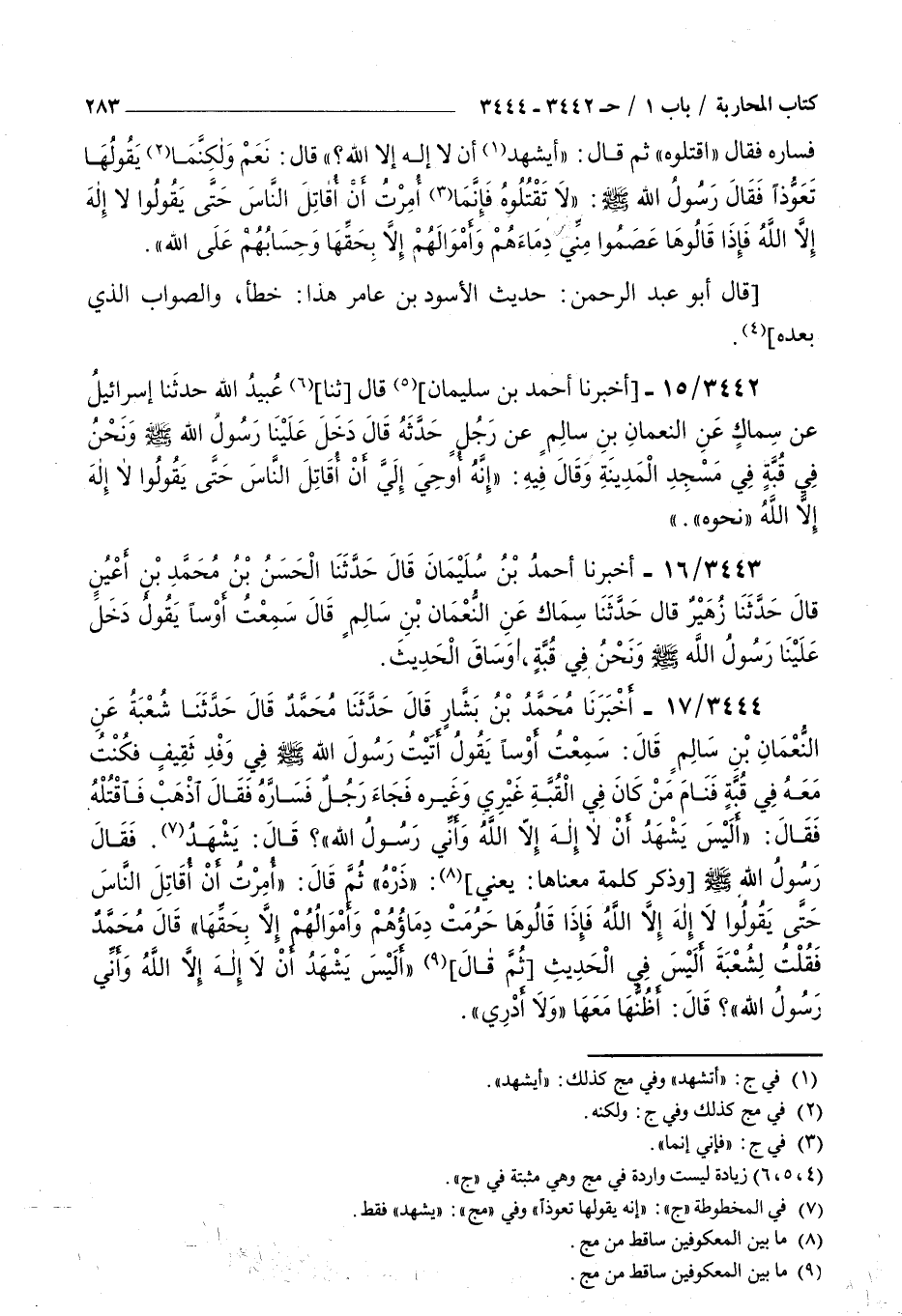 3444 - أخبرنا محمد بن بشار قال حدثنا محمد قال حدثنا شعبة عن النعمان بن سالم قال سمعت أوسا يقول : أتيت رسول الله صلى الله عليه و سلم في وفد ثقيف فكنت معه في قبة فنام من كان في القبة غيري وغيره فجاء رجل فساره فقال اذهب فاقتله فقال أليس يشهد أن لا إله إلا الله وأني رسول الله قال يشهد فقال رسول الله صلى الله عليه و سلم وذكر كلمة معناها يعني ذره ثم قال أمرت أن أقاتل الناس حتى يقولوا لا إله إلا الله فإذا قالوها حرمت دماؤهم وأموالهم إلا بحقها قال محمد فقلت لشعبة أليس في الحديث ثم قال أليس يشهد أن لا إله إلا الله وأني رسول الله قال أظنها معها ولا أدري