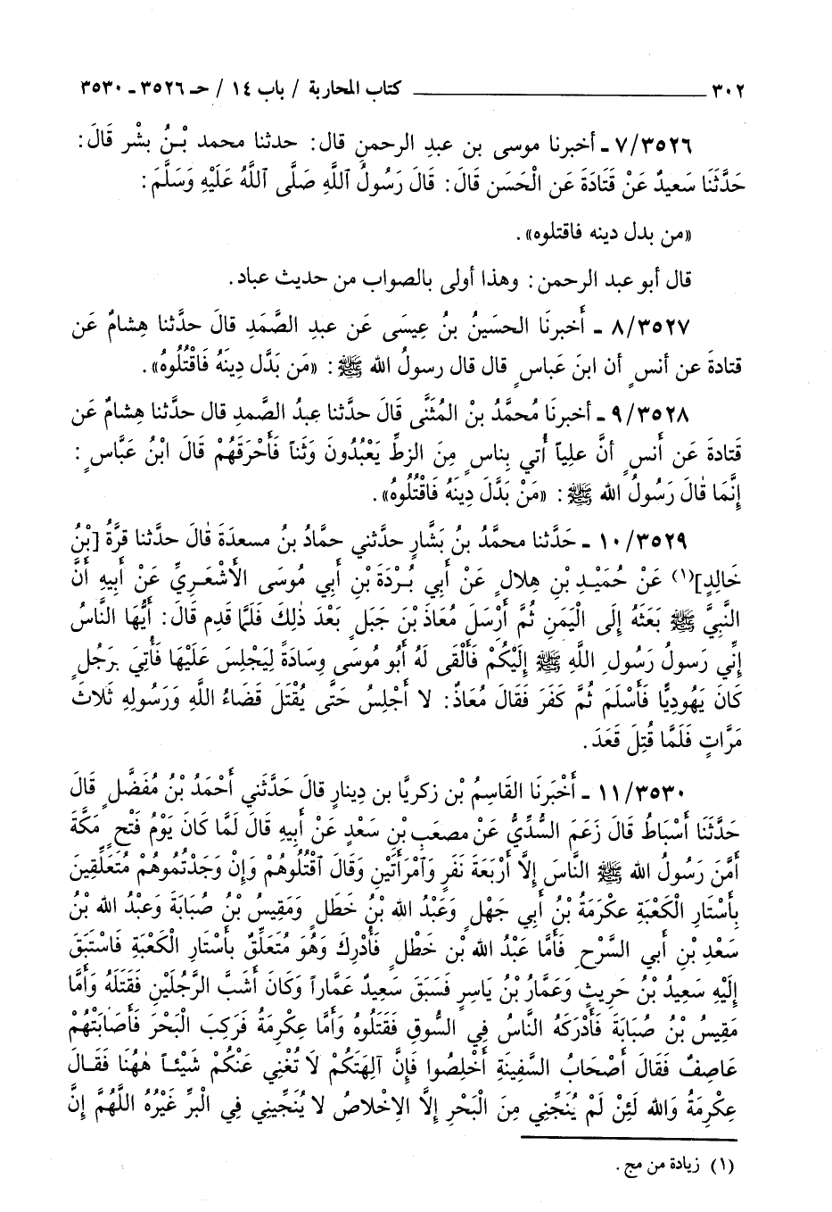 3526 - أخبرنا موسى بن عبد الرحمن قال حدثنا محمد بن بشر قال حدثنا سعيد عن قتادة عن الحسن قال قال رسول الله صلى الله عليه و سلم : من بدل دينه فاقتلوه قال أبو عبد الرحمن وهذا أولى بالصواب من حديث عباد