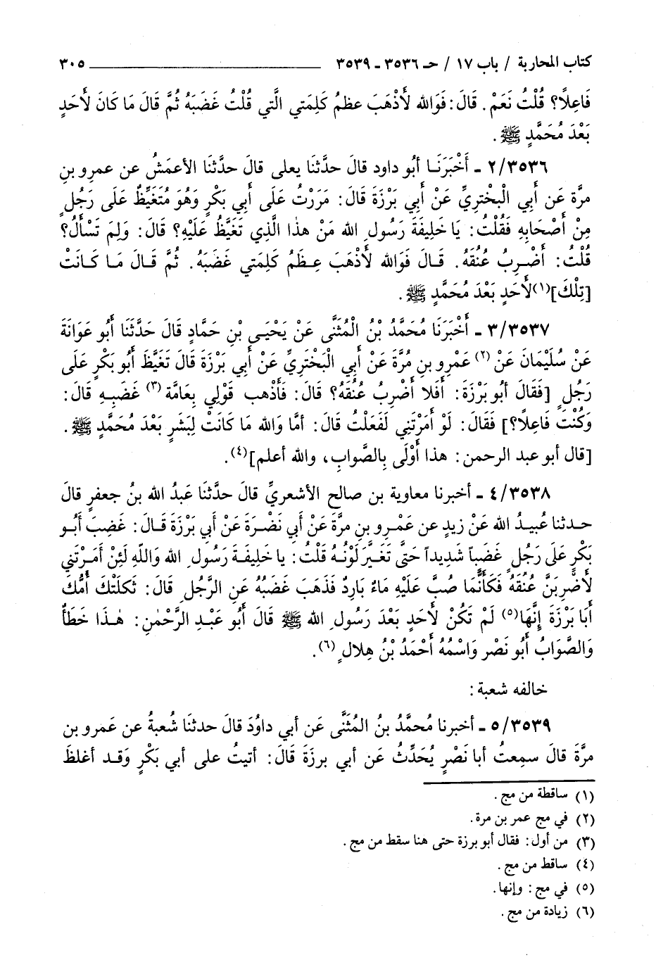 3537 - أخبرنا محمد بن المثنى عن يحيى بن حماد قال حدثنا أبو عوانة عن سليمان عن عمرو بن مرة عن أبي البختري عن أبي برزة قال : تغيظ أبو بكر على رجل فقال أبو برزة أفلا أضرب عنقه قال فأذهب قولي بعمامة غضبه قال وكنت فاعلا قال لو أمرتني لفعلت قال أما والله ما كانت لبشر بعد محمد صلى الله عليه و سلم قال أبو عبد الرحمن هذا أولى بالصواب والله أعلم