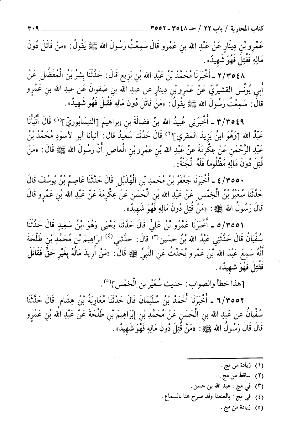 3551 - أخبرنا عمرو بن علي قال حدثنا يحيى وهو بن سعيد قال حدثنا سفيان قال حدثني عبد الله بن حسين قال حدثني إبراهيم بن محمد بن طلحة أنه سمع عبد الله بن عمرو يحدث عن النبي صلى الله عليه و سلم قال : من أريد ماله بغير حق فقاتل فقتل فهو شهيد هذا خطأ والصواب حديث سعير بن الخمس