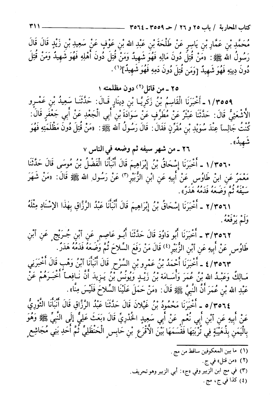 3560 - أخبرنا إسحاق بن إبراهيم قال أنبأنا الفضل بن موسى قال حدثنا معمر عن بن طاوس عن أبيه عن بن الزبير عن رسول الله صلى الله عليه و سلم قال : من شهر سيفه ثم وضعه فدمه هدر