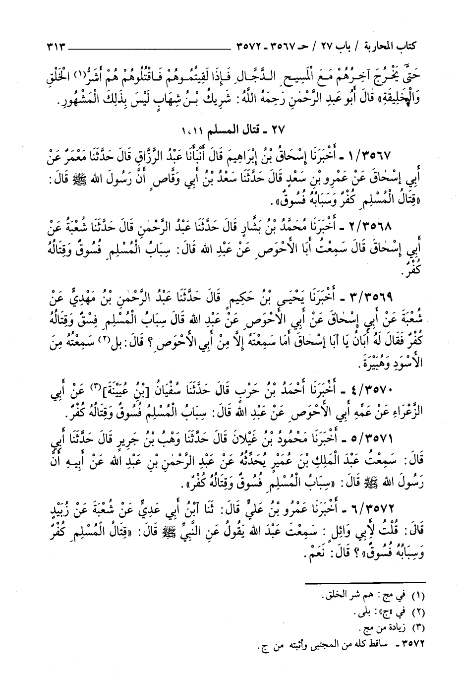 3570 - أخبرنا أحمد بن حرب قال حدثنا سفيان بن عيينة عن أبي الزعراء عن عمه أبي الأحوص عن عبد الله قال : سباب المسلم فسوق وقتاله كفر