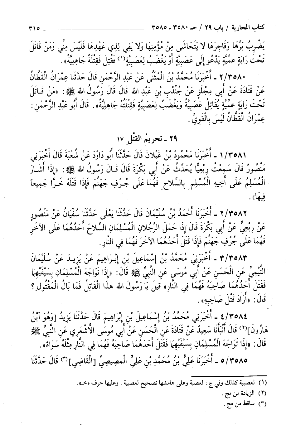 3582 - أخبرنا أحمد بن سليمان قال حدثنا يعلى حدثنا سفيان عن منصور عن ربعي عن أبي بكرة قال : إذا حمل الرجلان المسلمان السلاح أحدهما على الآخر فهما على جرف جهنم فإذا قتل أحدهما الآخر فهما في النار