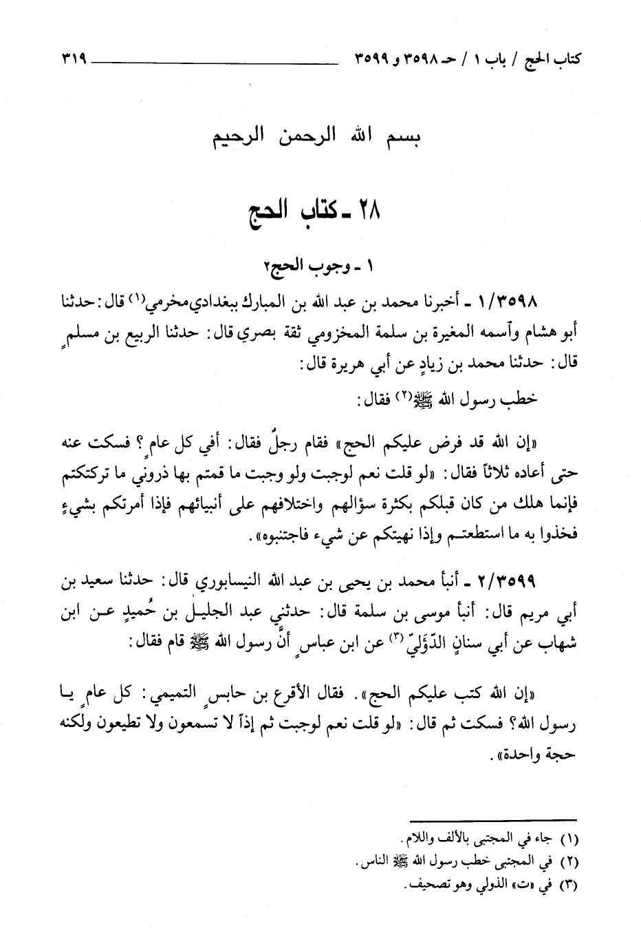 3598 - أخبرنا محمد بن عبد الله بن المبارك ببغدادي مخرمي قال حدثنا أبو هشام واسمه المغيرة بن سلمة المخزومي ثقة بصري قال حدثنا الربيع بن مسلم قال حدثنا محمد بن زياد عن أبي هريرة قال خطب رسول الله صلى الله عليه و سلم فقال : إن الله قد فرض عليكم الحج فقام رجل فقال أفي كل عام فسكت عنه حتى أعاده ثلاثا فقال لو قلت نعم لوجبت ولو وجبت ما قمتم بها ذروني ما تركتكم فإنما هلك من كان قبلكم بكثرة سؤالهم واختلافهم على أنبيائهم فإذا أمرتكم بشيء فخذوا به ما استطعتم وإذا نهيتكم عن شيء فاجتنبوه