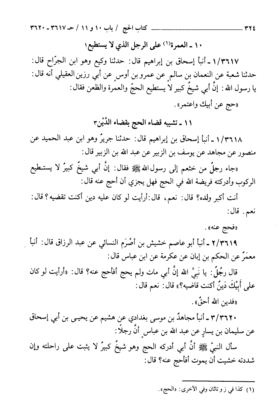 3617 - أنبأ إسحاق بن إبراهيم قال حدثنا وكيع وهو بن الجراح قال حدثنا شعبة عن النعمان بن سالم عن عمرو بن أوس عن أبي رزين العقيلي أنه قال : يا رسول الله إن أبي شيخ كبير لا يستطيع الحج والعمرة والظعن فقال حج عن أبيك واعتمر