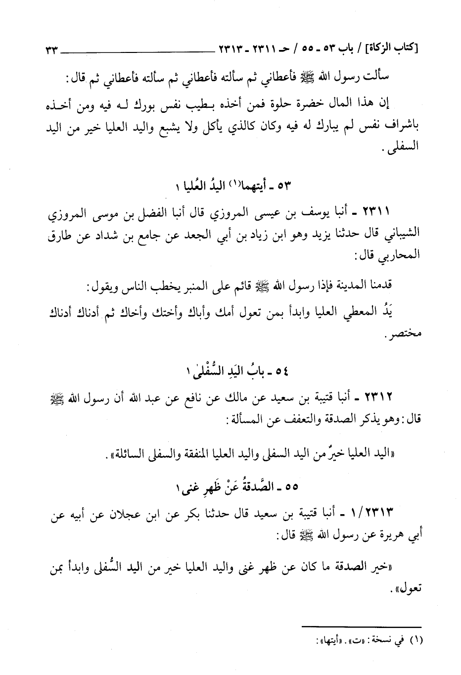 2312 - أنبأ قتيبة بن سعيد عن مالك عن نافع عن عبد الله أن رسول الله صلى الله عليه و سلم قال وهو يذكر الصدقة والتعفف عن المسألة : اليد العليا خير من اليد السفلى واليد العليا المنفقة والسفلى السائلة