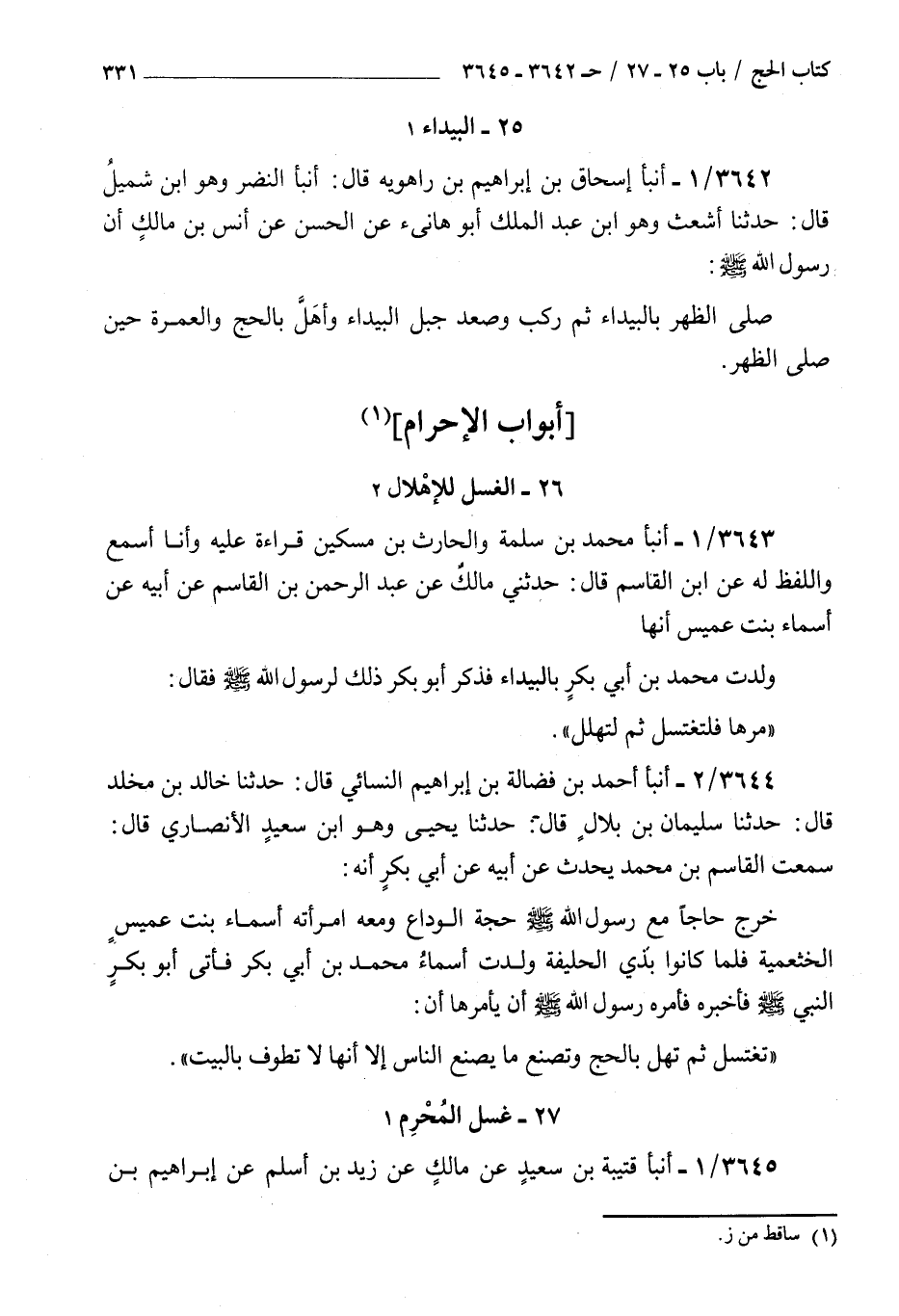 3643 - أنبأ محمد بن سلمة والحارث بن مسكين قراءة عليه وأنا أسمع واللفظ له عن بن القاسم قال حدثني مالك عن عبد الرحمن بن القاسم عن أبيه عن أسماء بنت عميس : أنها ولدت محمد بن أبي بكر بالبيداء فذكر أبو بكر ذلك لرسول الله صلى الله عليه و سلم فقال مرها فلتغتسل ثم لتهلل