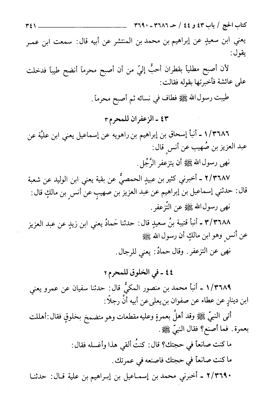 3686 - أنبأ إسحاق بن إبراهيم بن راهويه عن إسماعيل يعني بن علية عن عبد العزيز بن صهيب عن أنس قال : نهى رسول الله صلى الله عليه و سلم أن يتزعفر الرجل