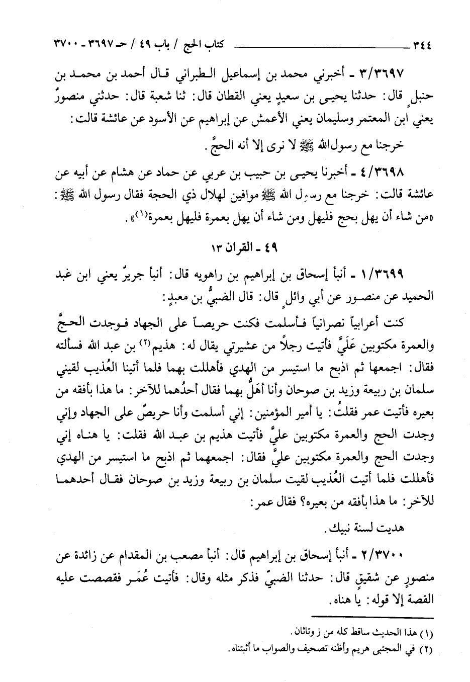 3699 - أنبأ إسحاق بن إبراهيم بن راهويه قال أنبأ جرير يعني بن عبد الحميد عن منصور عن أبي وائل قال قال الضبي بن معبد : كنت أعرابيا نصرانيا فأسلمت فكنت حريصا على الجهاد فوجدت الحج والعمرة مكتوبين علي فأتيت رجلا من عشيرتي يقال له هذيم بن عبد الله فسألته فقال اجمعها ثم اذبح ما استيسر من الهدي فأهللت بهما فلما أتينا العذيب لقيني سلمان بن ربيعة وزيد بن صوحان وأنا أهل بهما فقال أحدهما للآخر ما هذا بأفقه من بعيره فأتيت عمر فقلت يا أمير المؤمنين إني أسلمت وأنا حريص على الجهاد وإني وجدت الحج والعمرة مكتوبين علي فأتيت هذيم بن عبد الله فقلت يا هناه إني وجدت الحج والعمرة مكتوبين علي فقال اجمعهما ثم اذبح ما استيسر من الهدي فأهللت فلما أتيت العذيب لقيت سلمان بن ربيعة وزيد بن صوحان فقال أحدهما للآخر ما هذا بأفقه من بعيره فقال عمر هديت لسنة نبيك