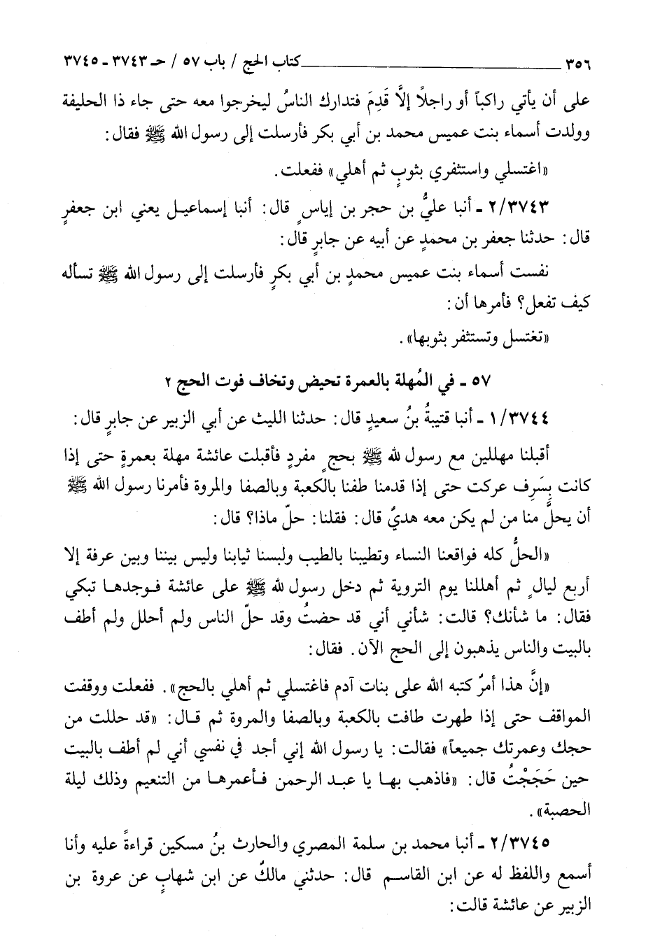 3744 - أنبأ قتيبة بن سعيد قال حدثنا الليث عن أبي الزبير عن جابر قال : أقبلنا مهللين مع رسول الله صلى الله عليه و سلم بحج مفرد فأقبلت عائشة مهلة بعمرة حتى إذا كانت بسرف عركت حتى إذا قدمنا طفنا بالكعبة وبالصفا والمروة فأمرنا رسول الله صلى الله عليه و سلم أن يحل منا من لم يكن معه هدي قال فقلنا حل ماذا قال الحل كله فواقعنا النساء وتطيبنا بالطيب ولبسنا ثيابنا وليس بيننا وبين عرفة إلا أربع ليال ثم أهللنا يوم التروية ثم دخل رسول الله صلى الله عليه و سلم على عائشة فوجدها تبكي فقال ما شأنك قالت شأني أني قد حضت وقد حل الناس ولم أحلل ولم أطف بالبيت والناس يذهبون إلى الحج الآن فقال إن هذا أمر كتبه الله على بنات آدم فاغتسلي ثم أهلي بالحج ففعلت ووقفت المواقف حتى إذا طهرت طافت بالكعبة وبالصفا والمروة ثم قال قد حللت من حجك وعمرتك جميعا فقالت يا رسول الله إني أجد في نفسي أني لم أطف بالبيت حين حججت قال فاذهب بها يا عبد الرحمن فأعمرها من التنعيم وذلك ليلة الحصبة