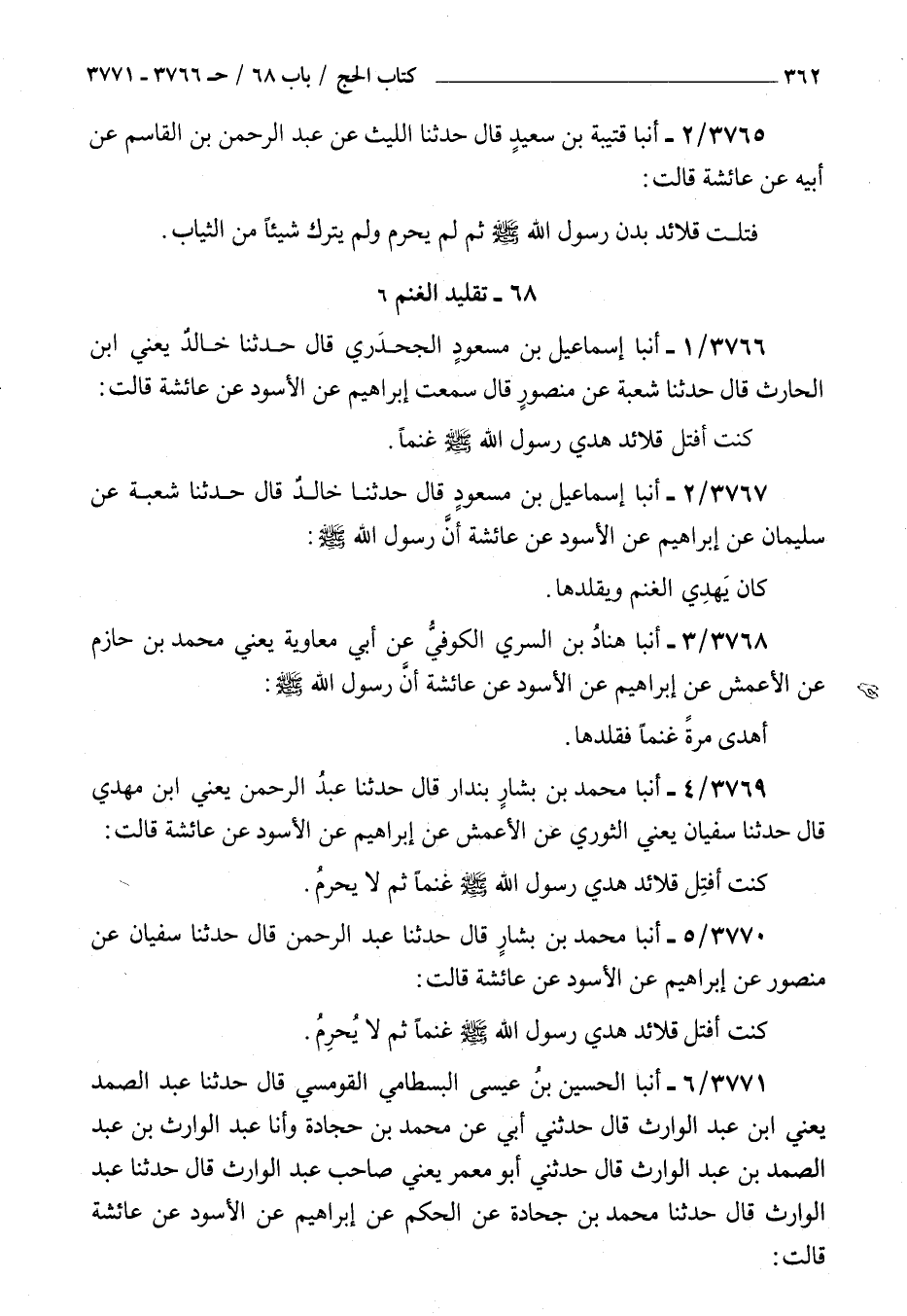 3768 - أنبأ هناد بن السري الكوفي عن أبي معاوية يعني محمد بن حازم عن الأعمش عن إبراهيم عن الأسود عن عائشة : أن رسول الله صلى الله عليه و سلم أهدى مرة غنما فقلدها