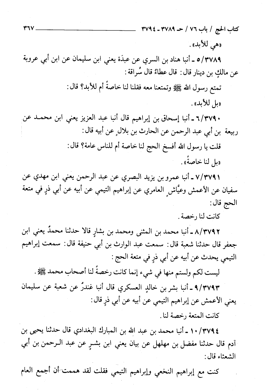 3789 - أنبأ هناد بن السري عن عبدة يعني بن سليمان عن بن أبي عروبة عن مالك بن دينار قال قال عطاء قال سراقة : تمتع رسول الله صلى الله عليه و سلم وتمتعنا معه فقلنا لنا خاصة أم للأبد قال بل للأبد