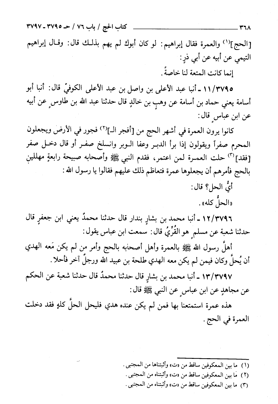 3795 - أنبأ عبد الأعلى بن واصل بن عبد الأعلى الكوفي قال أنبأ أبو أسامة يعني حماد بن أسامة عن وهب بن خالد قال حدثنا عبد الله بن طاوس عن أبيه عن بن عباس قال : كانوا يرون العمرة في أشهر الحج من أفجر الفجور في الأرض ويجعلون المحرم صفرا ويقولون إذا برأ الدبر وعفا الوبر وانسلخ صفر أو قال دخل صفر فقد حلت العمرة لمن اعتمر فقدم النبي صلى الله عليه و سلم وأصحابه صبيحة رابعة مهللين بالحج فأمرهم أن يجعلوها عمرة فتعاظم ذلك عليهم فقالوا يا رسول الله أي الحل قال الحل كله