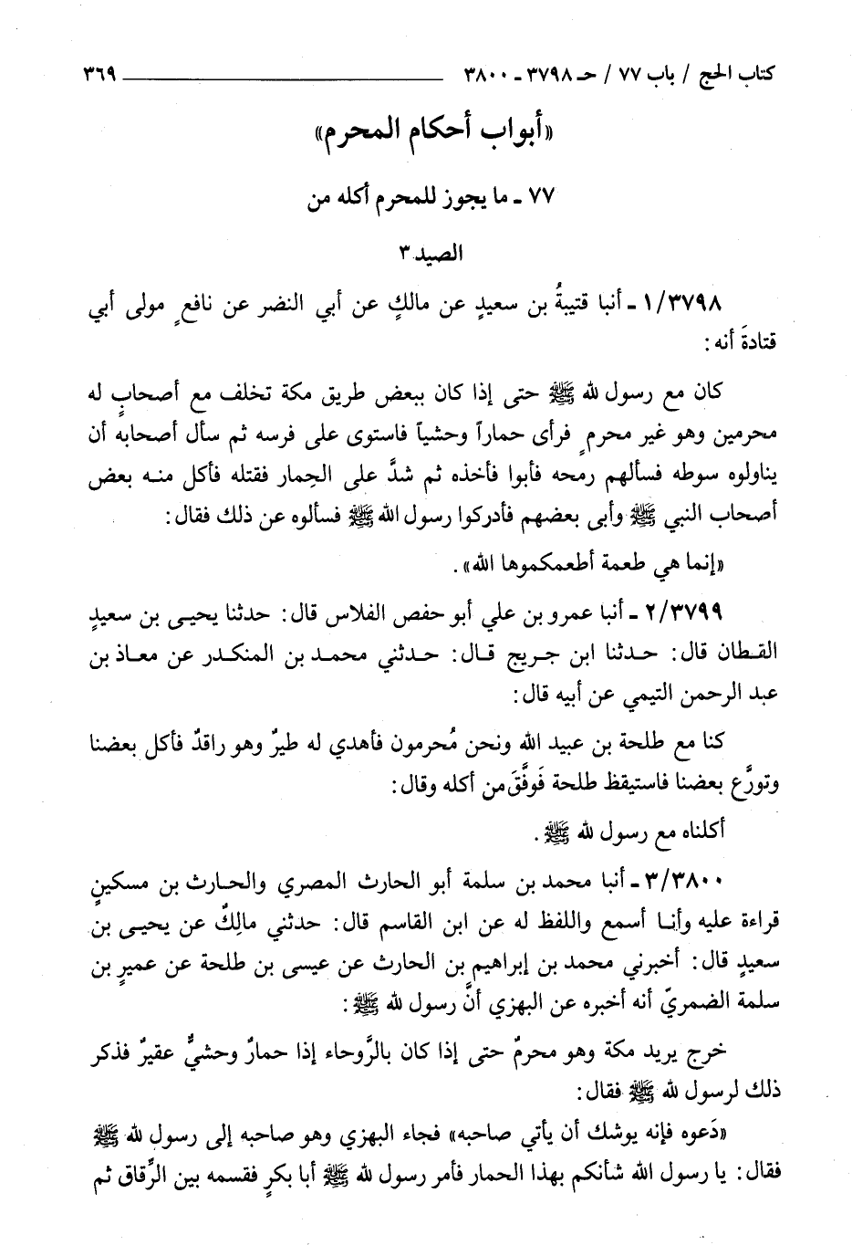 3798 - أنبأ قتيبة بن سعيد عن مالك عن أبي النضر عن نافع مولى أبي قتادة أنه : كان مع رسول الله صلى الله عليه و سلم حتى إذا كان ببعض طريق مكة تخلف مع أصحاب له محرمين وهو غير محرم فرأى حمارا وحشيا فاستوى على فرسه ثم سأل أصحابه أن يناولوه سوطه فسألهم رمحه فأبوا فأخذه ثم شد على الحمار فقتله فأكل منه بعض أصحاب النبي صلى الله عليه و سلم وأبى بعضهم فأدركوا رسول الله صلى الله عليه و سلم فسألوه عن ذلك فقال إنما هي طعمة أطعمكموها الله