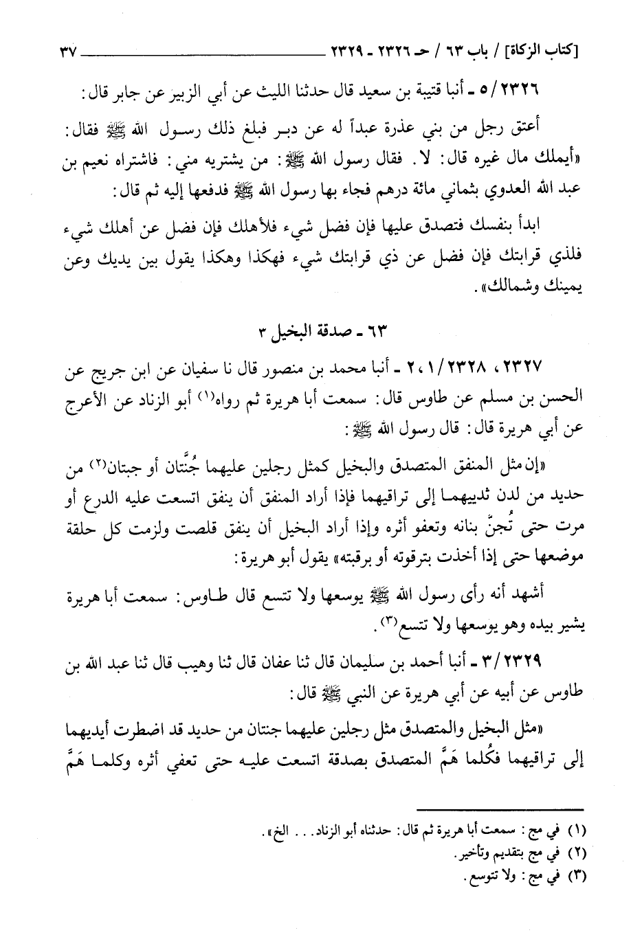2329 - أنبأ أحمد بن سليمان قال ثنا عفان قال ثنا وهيب قال ثنا عبد الله بن طاوس عن أبيه عن أبي هريرة عن النبي صلى الله عليه و سلم قال : مثل البخيل والمتصدق مثل رجلين عليهما جنتان من حديد قد اضطرت أيديهما إلى تراقيهما فكلما هم المتصدق بصدقة اتسعت عليه حتى تعفي أثره وكلما هم البخيل بصدقة تقبضت كل حلقة إلى صاحبتها وتقلصت عليه وانضمت يداه إلى تراقيه وسمعت رسول الله صلى الله عليه و سلم يقول فيجهد أن يوسعها فلا تتسع
