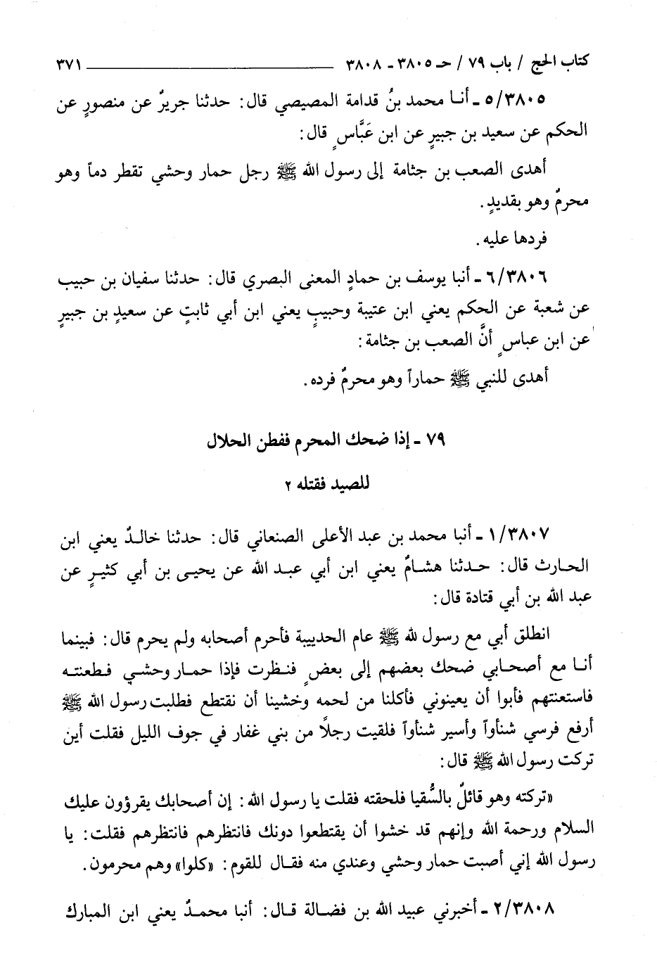 3805 - أنا محمد بن قدامة المصيصي قال حدثنا جرير عن منصور عن الحكم عن سعيد بن جبير عن بن عباس قال : أهدى الصعب بن جثامة إلى رسول الله صلى الله عليه و سلم رجل حمار وحشي تقطر دما وهو محرم وهو بقديد فردها عليه