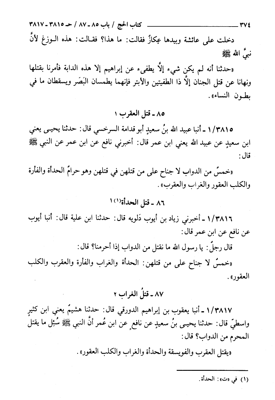 3815 - أنبأ عبيد الله بن سعيد أبو قدامة السرخسي قال حدثنا يحيى يعني بن سعيد عن عبيد الله يعني بن عمر قال أخبرني نافع عن بن عمر عن النبي صلى الله عليه و سلم قال : خمس من الدواب لا جناح على من قتلهن في قتلهن وهو حرام الحدأة والفأرة والكلب العقور والغراب والعقرب