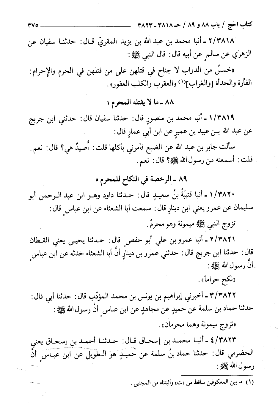 3818 - أنبأ محمد بن عبد الله بن يزيد المقري قال حدثنا سفيان عن الزهري عن سالم عن أبيه قال قال النبي صلى الله عليه و سلم : خمس من الدواب لا جناح في قتلهن على من قتلهن في الحرم والإحرام الفأرة والحدأة والغراب والعقرب والكلب العقور