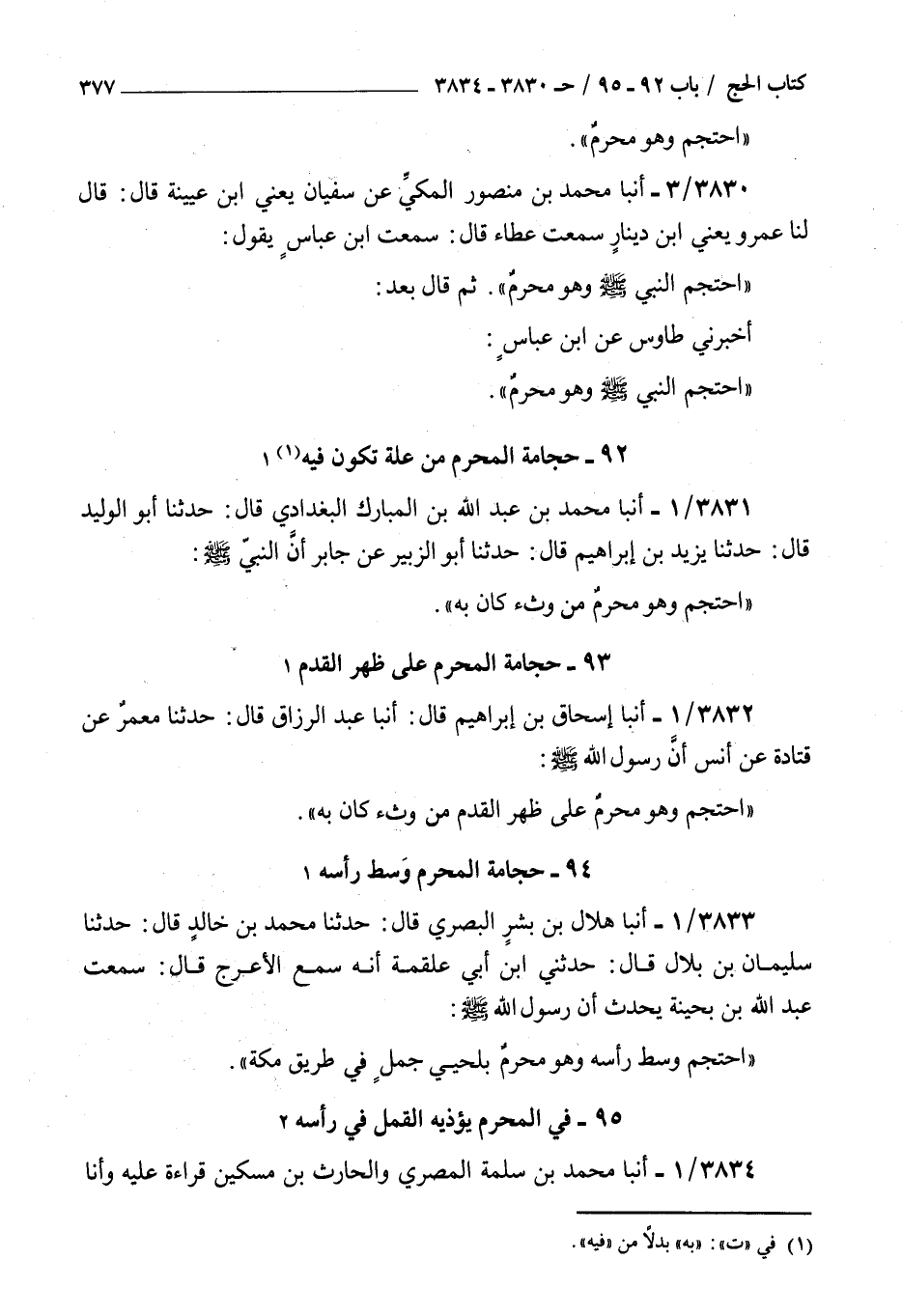 3832 - أنبأ إسحاق بن إبراهيم قال أنبأ عبد الرزاق قال حدثنا معمر عن قتادة عن أنس : أن رسول الله صلى الله عليه و سلم احتجم وهو محرم على ظهر القدم من وثء كان به