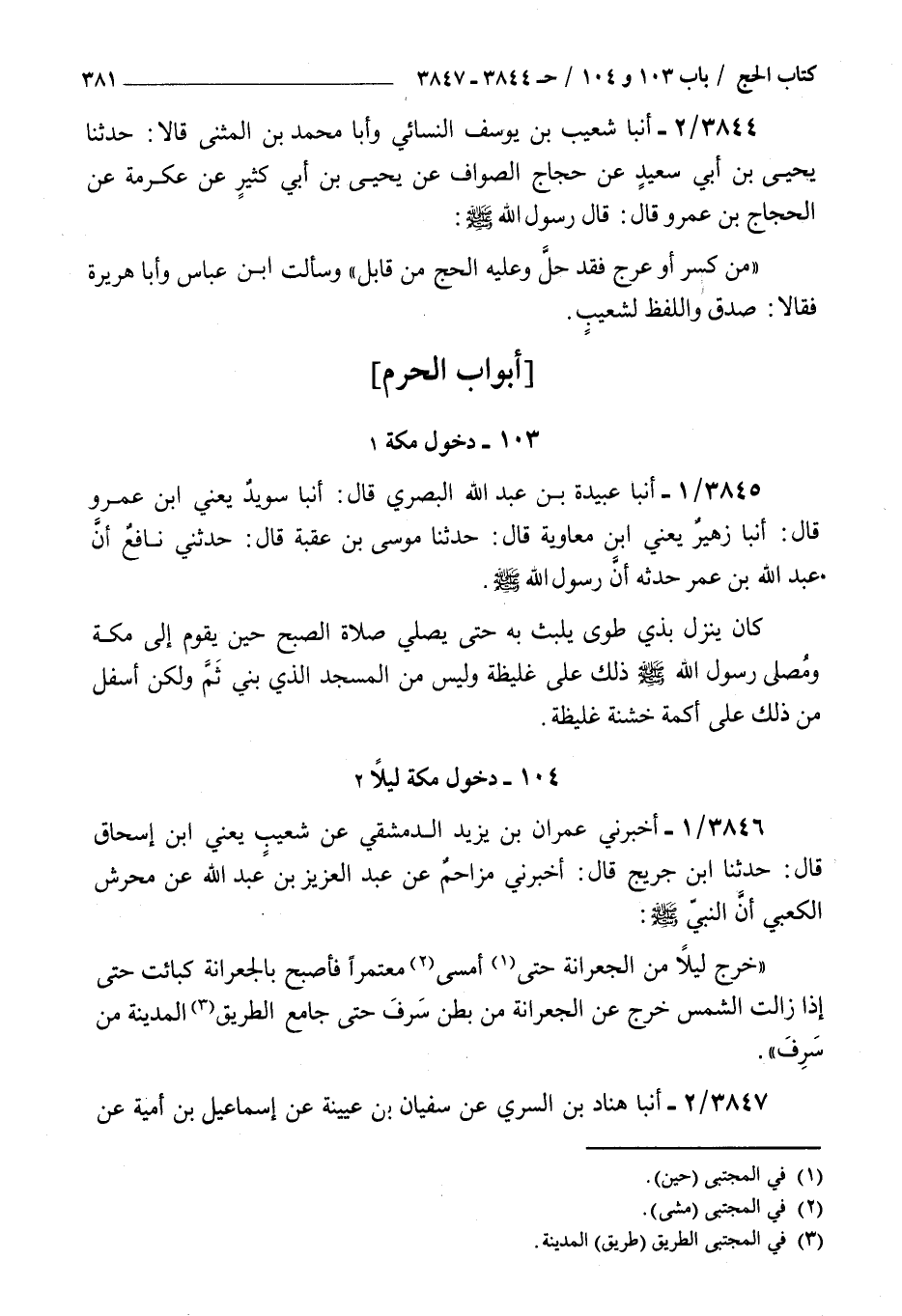 3846 - أخبرني عمران بن يزيد الدمشقي عن شعيب يعني بن إسحاق قال حدثنا بن جريج قال أخبرني مزاحم عن عبد العزيز بن عبد الله عن محرش الكعبي : أن النبي صلى الله عليه و سلم خرج ليلا من الجعرانة حتى أمسى معتمرا فأصبح بالجعرانة كبائت حتى إذا زالت الشمس خرج عن الجعرانة من بطن سرف حتى جامع الطريق المدينة من سرف