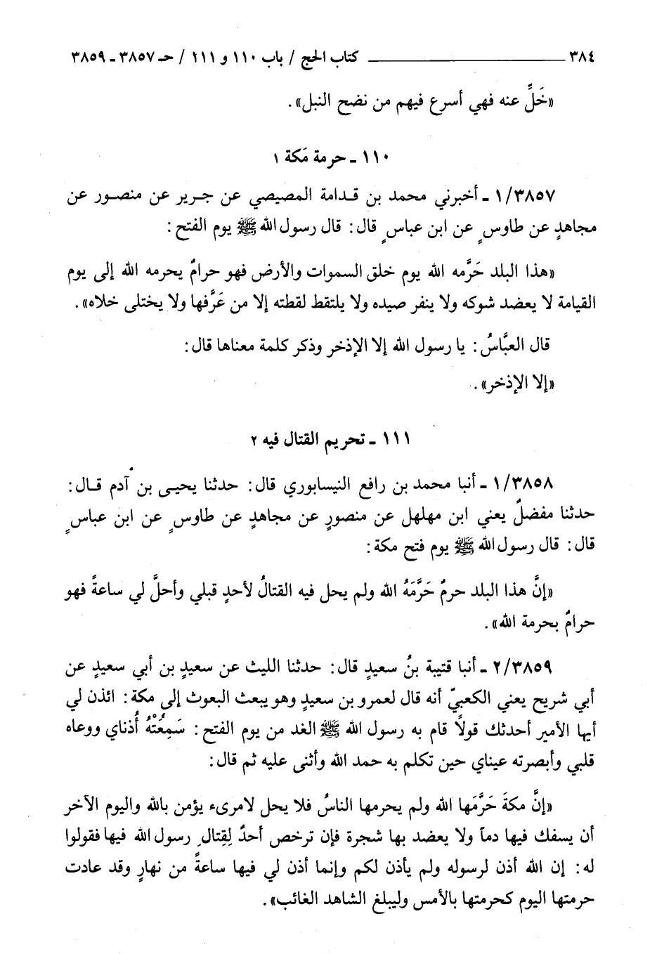 3859 - أنبأ قتيبة بن سعيد قال حدثنا الليث عن سعيد بن أبي سعيد عن أبي شريح يعني الكعبي أنه قال لعمرو بن سعيد وهو يبعث البعوث إلى مكة ائذن لي أيها الأمير أحدثك قولا قام به رسول الله صلى الله عليه و سلم الغد من يوم الفتح سمعته أذناي ووعاه قلبي وأبصرته عيناي حين تكلم به حمد الله وأثنى عليه ثم قال : إن مكة حرمها الله ولم يحرمها الناس فلا يحل لامرئ يؤمن بالله واليوم الآخر أن يسفك فيها دما ولا يعضد بها شجرة فإن ترخص أحد لقتال رسول الله فيها فقولوا له إن الله أذن لرسوله ولم يأذن لكم وإنما أذن لي فيها ساعة من نهار وقد عادت حرمتها اليوم كحرمتها بالأمس وليبلغ الشاهد الغائب
