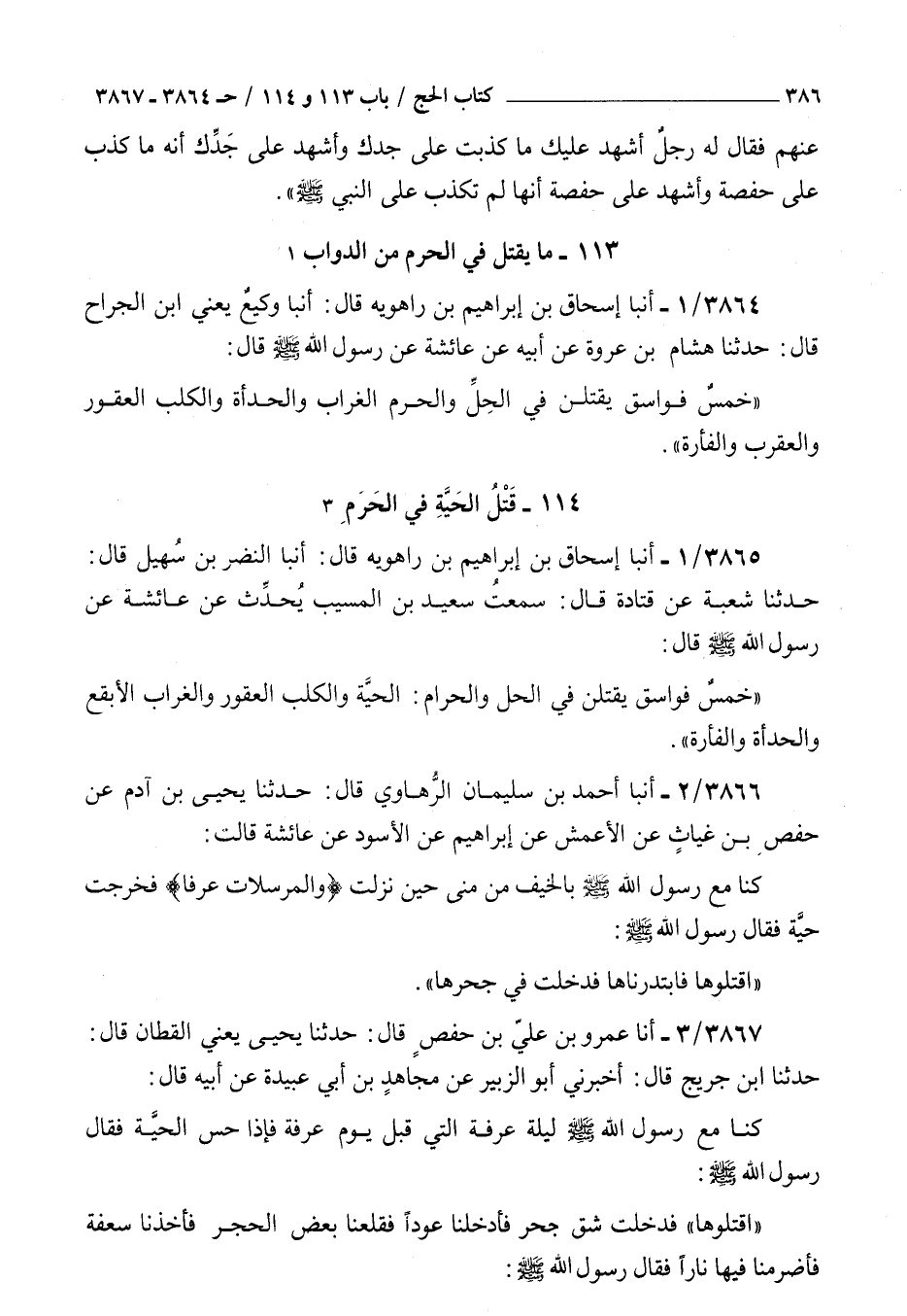 3865 - أنبأ إسحاق بن إبراهيم بن راهويه قال أنبأ النضر بن سهيل قال حدثنا شعبة عن قتادة قال سمعت سعيد بن المسيب يحدث عن عائشة عن رسول الله صلى الله عليه و سلم قال : خمس فواسق يقتلن في الحل والحرام الحية والكلب العقور والغراب الأبقع والحدأة والفأرة
