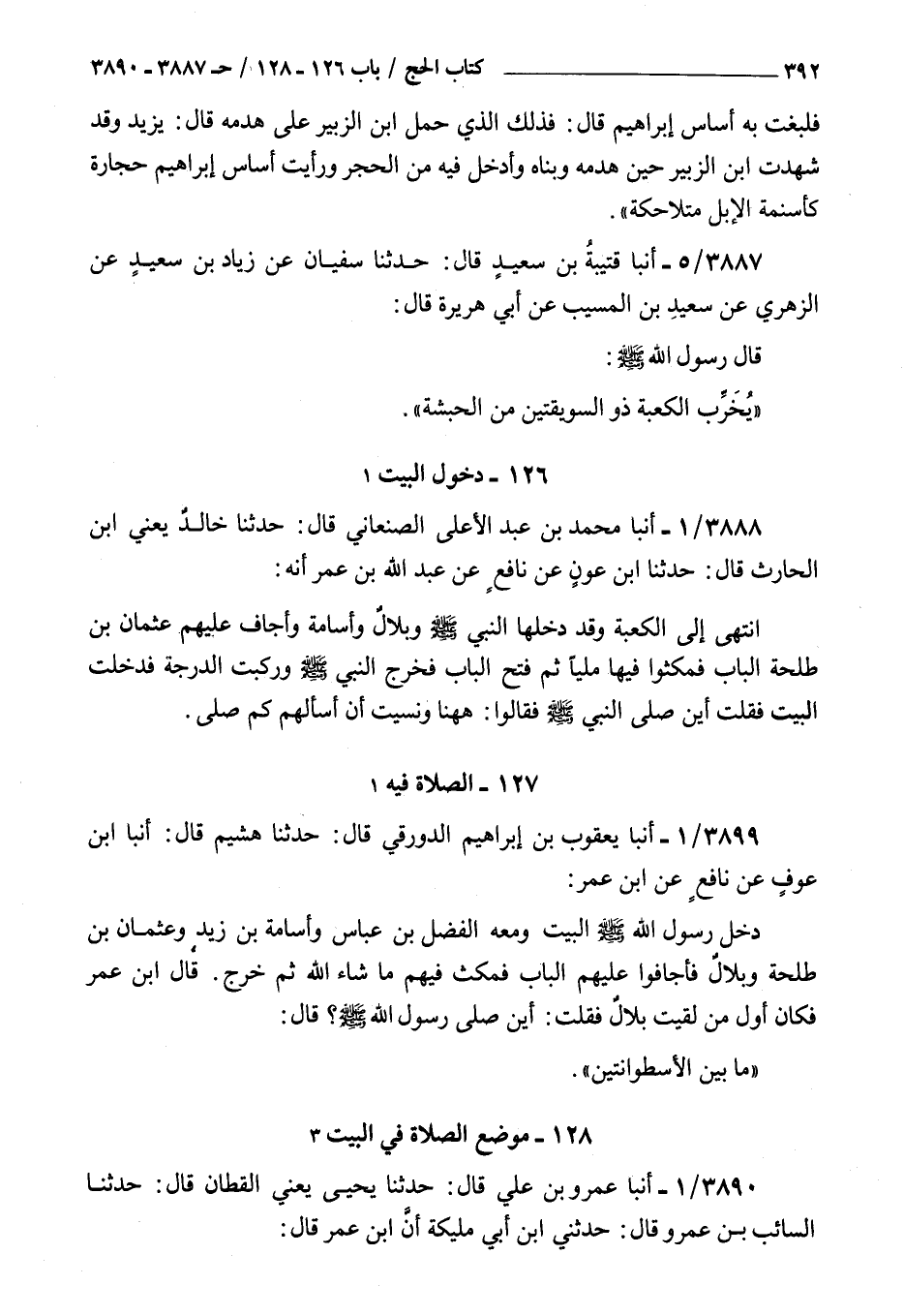 3889 - أنبأ يعقوب بن إبراهيم الدورقي قال حدثنا هشيم قال أنبأ بن عوف عن نافع عن بن عمر : دخل رسول الله صلى الله عليه و سلم البيت ومعه الفضل بن عباس وأسامة بن زيد وعثمان بن طلحة وبلال فأجافوا عليهم الباب فمكث فيهم ما شاء الله ثم خرج قال بن عمر فكان أول من لقيت بلال فقلت أين صلى رسول الله صلى الله عليه و سلم قال ما بين الاسطوانتين