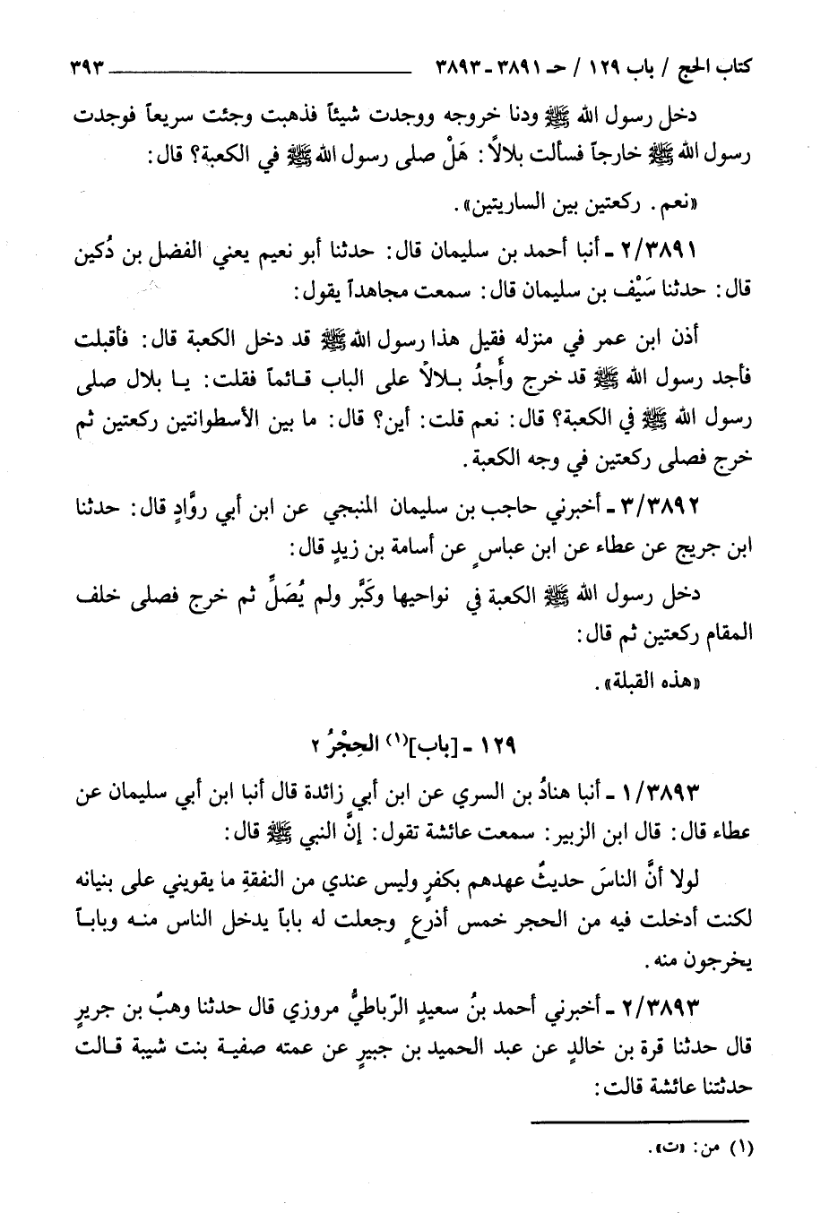 3891 - أنبأ أحمد بن سليمان قال حدثنا أبو نعيم يعني الفضل بن دكين قال حدثنا سيف بن سليمان قال سمعت مجاهدا يقول : أذن بن عمر في منزله فقيل هذا رسول الله صلى الله عليه و سلم قد دخل الكعبة قال فأقبلت فأجد رسول الله صلى الله عليه و سلم قد خرج وأجد بلالا على الباب قائما فقلت يا بلال صلى رسول الله صلى الله عليه و سلم في الكعبة قال نعم قلت أين قال ما بين الاسطوانتين ركعتين ثم خرج فصلى ركعتين في وجه الكعبة