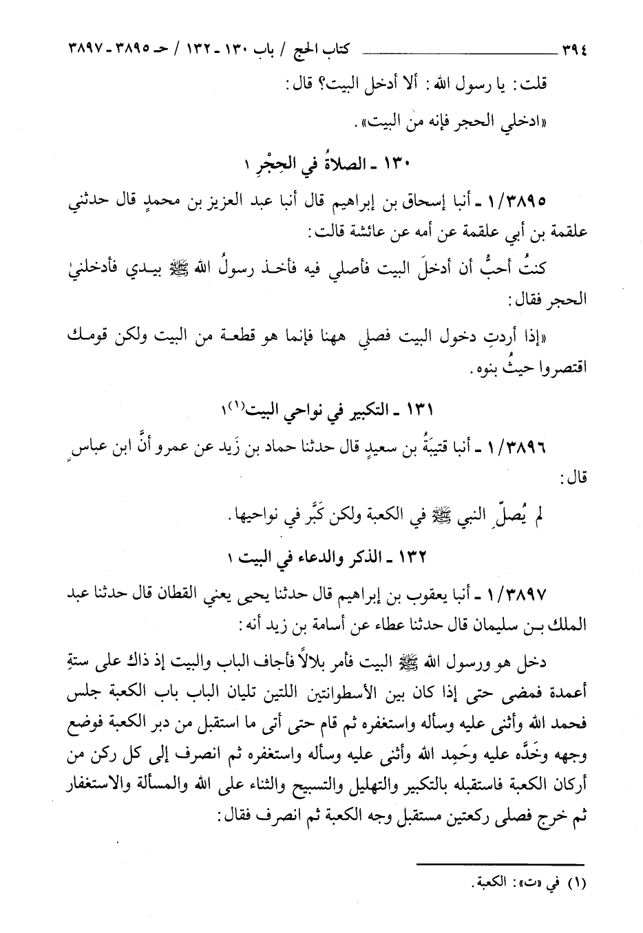 3895 - أنبأ إسحاق بن إبراهيم قال أنبأ عبد العزيز بن محمد قال حدثني علقمة بن أبي علقمة عن أمه عن عائشة قالت : كنت أحب أن أدخل البيت فأصلي فيه فأخذ رسول الله صلى الله عليه و سلم بيدي فأدخلني الحجر فقال إذا أردت دخول البيت فصلي ههنا فإنما هو قطعة من البيت ولكن قومك اقتصروا حيث بنوه