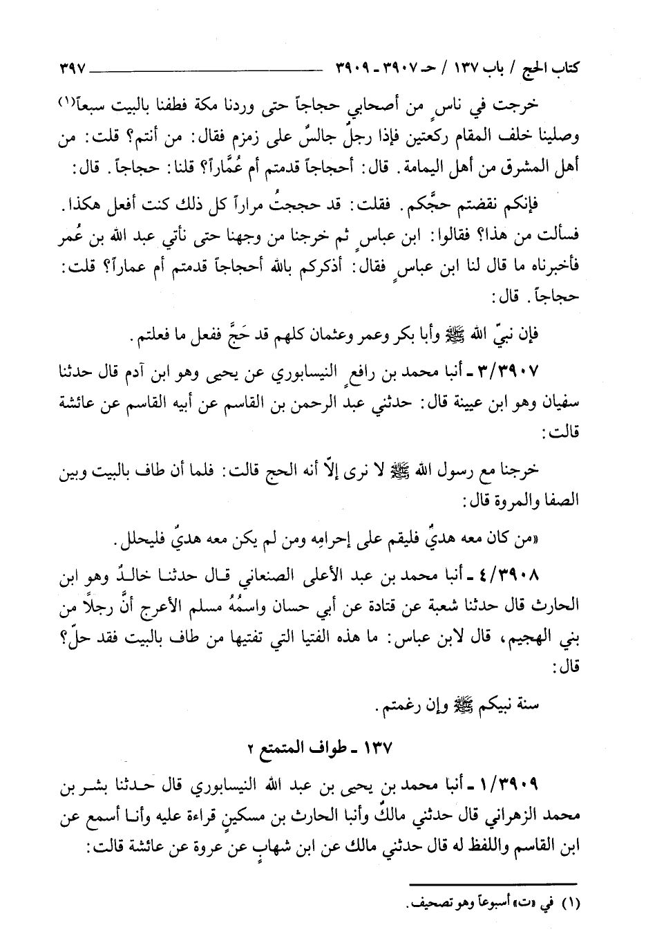 3907 - أنبأ محمد بن رافع النيسابوري عن يحيى وهو بن آدم قال حدثنا سفيان وهو بن عيينة قال حدثني عبد الرحمن بن القاسم عن أبيه القاسم عن عائشة قالت : خرجنا مع رسول الله صلى الله عليه و سلم لا نرى إلا أنه الحج قالت فلما أن طاف بالبيت وبين الصفا والمروة قال من كان معه هدي فليقم على إحرامه ومن لم يكن معه هدي فليحلل