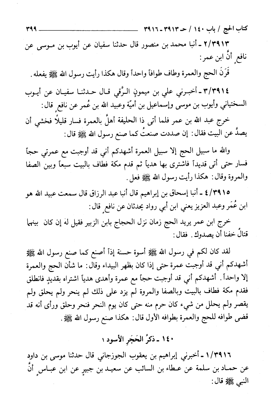 3913 - أنبأ محمد بن منصور قال حدثنا سفيان عن أيوب بن موسى عن نافع : أن بن عمر قرن الحج والعمرة وطاف طوافا واحدا وقال هكذا رأيت رسول الله صلى الله عليه و سلم يفعله