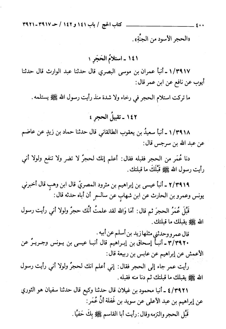3917 - أنبأ عمران بن موسى البصري قال حدثنا عبد الوارث قال حدثنا أيوب عن نافع عن بن عمر قال : ما تركت استلام الحجر في رخاء ولا شدة منذ رأيت رسول الله صلى الله عليه و سلم يستلمه
