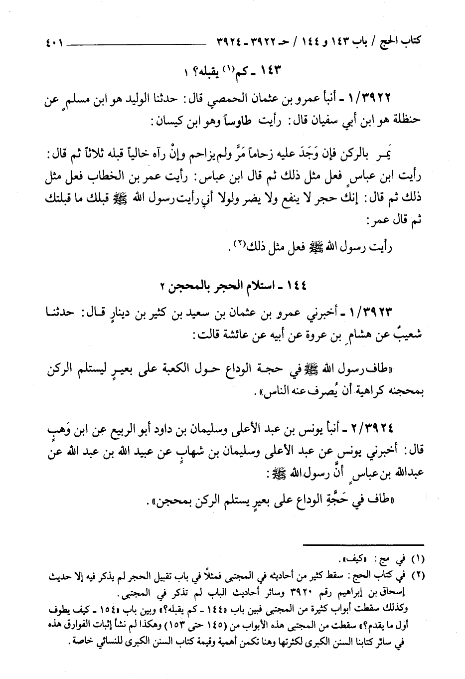 3922 - أنبأ عمرو بن عثمان الحمصي قال حدثنا الوليد هو بن مسلم عن حنظلة هو بن أبي سفيان قال : رأيت طاوسا وهو بن كيسان يمر بالركن فإن وجد عليه زحاما مر ولم يزاحم وإن رآه خاليا قبله ثلاثا ثم قال رأيت بن عباس فعل مثل ذلك ثم قال بن عباس رأيت عمر بن الخطاب فعل مثل ذلك ثم قال إنك حجر لا ينفع ولا يضر ولولا أني رأيت رسول الله صلى الله عليه و سلم قبلك ما قبلتك ثم قال عمر رأيت رسول الله صلى الله عليه و سلم فعل مثل ذلك