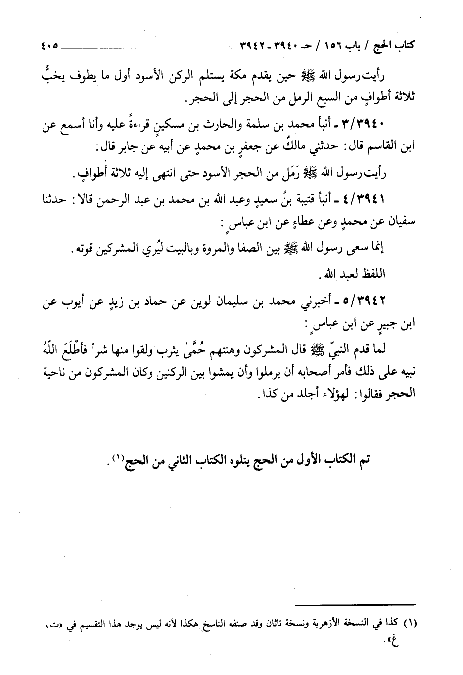 3942 - أخبرني محمد بن سليمان لوين عن حماد بن زيد عن أيوب عن بن جبير عن بن عباس : لما قدم النبي صلى الله عليه و سلم قال المشركون وهنتهم حمى يثرب ولقوا منها شرا فأطلع الله نبيه على ذلك فأمر أصحابه أن يرملوا وأن يمشوا بين الركنين وكان المشركون من ناحية الحجر فقالوا لهؤلاء تم الكتاب الأول من الحج يتلوه الكتاب الثاني من الحج