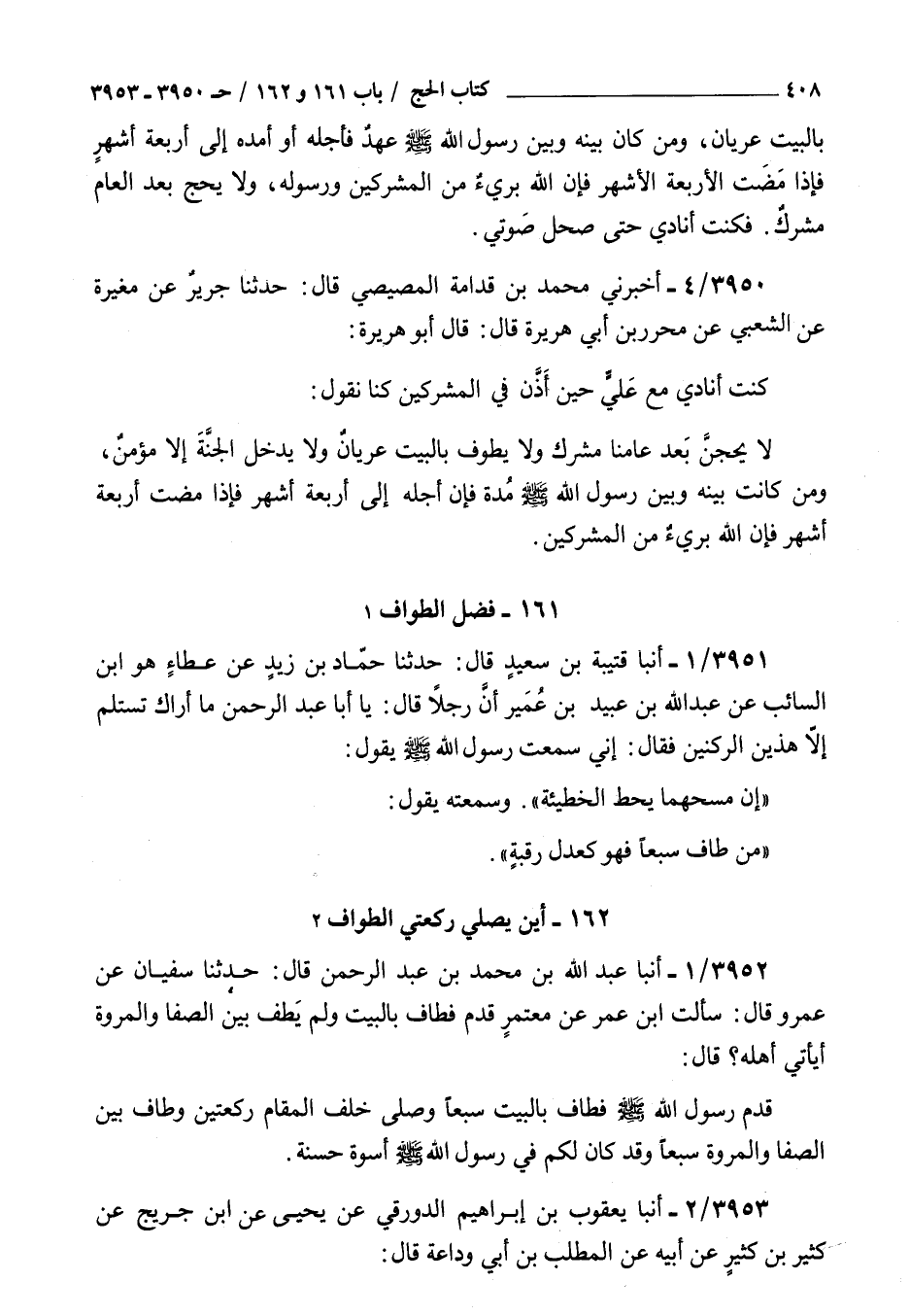 3952 - أنبأ عبد الله بن محمد بن عبد الرحمن قال حدثنا سفيان عن عمرو قال سألت بن عمر عن معتمر قدم فطاف بالبيت ولم يطف بين الصفا والمروة أيأتي أهله قال : قدم رسول الله صلى الله عليه و سلم فطاف بالبيت سبعا وصلى خلف المقام ركعتين وطاف بين الصفا والمروة سبعا وقد كان لكم في رسول الله صلى الله عليه و سلم أسوة حسنة
