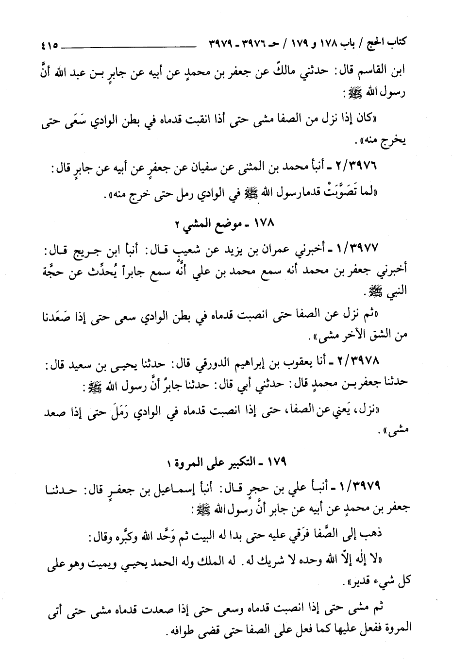 3977 - أخبرني عمران بن يزيد عن شعيب قال أنبأ بن جريج قال أخبرني جعفر بن محمد أنه سمع محمد بن علي : أنه سمع جابرا يحدث عن حجة النبي صلى الله عليه و سلم ثم نزل عن الصفا حتى انصبت قدماه في بطن الوادي سعى حتى إذا صعدنا من الشق الآخر مشى