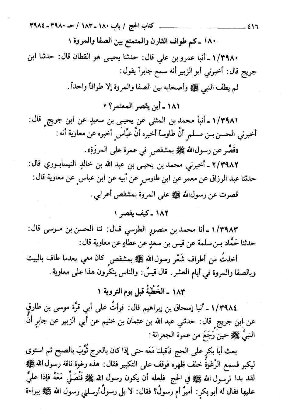 3980 - أنبأ عمرو بن علي قال حدثنا يحيى هو القطان قال حدثنا بن جريج قال أخبرني أبو الزبير أنه سمع جابرا يقول : لم يطف النبي صلى الله عليه و سلم وأصحابه بين الصفا والمروة إلا طوافا واحدا
