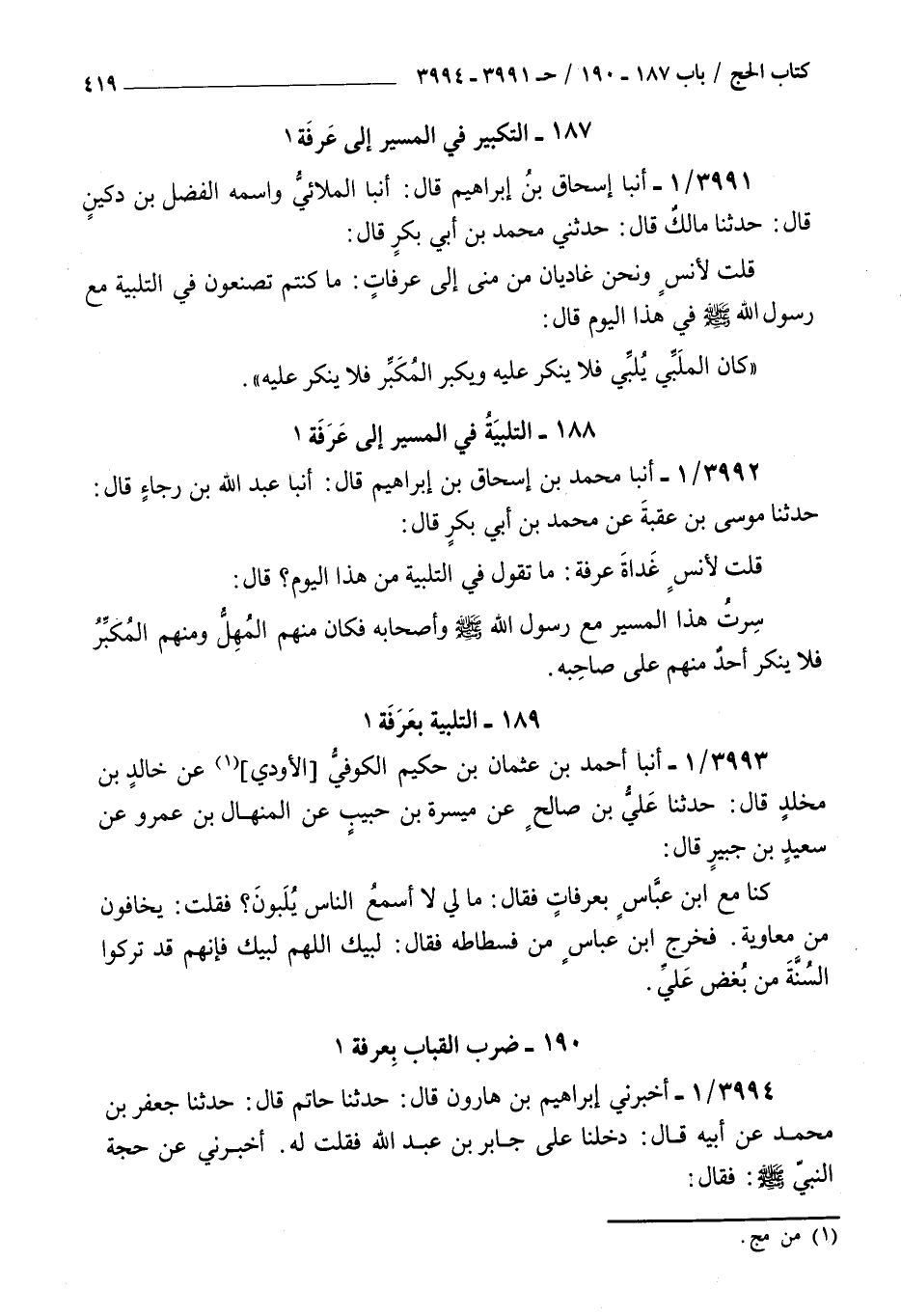3991 - أنبأ إسحاق بن إبراهيم قال أنبأ الملائي واسمه الفضل بن دكين قال حدثنا مالك قال حدثني محمد بن أبي بكر قال : قلت لأنس ونحن غاديان من منى إلى عرفات ما كنتم تصنعون في التلبية مع رسول الله صلى الله عليه و سلم في هذا اليوم قال كان الملبي يلبي فلا ينكر عليه ويكبر المكبر فلا ينكر عليه