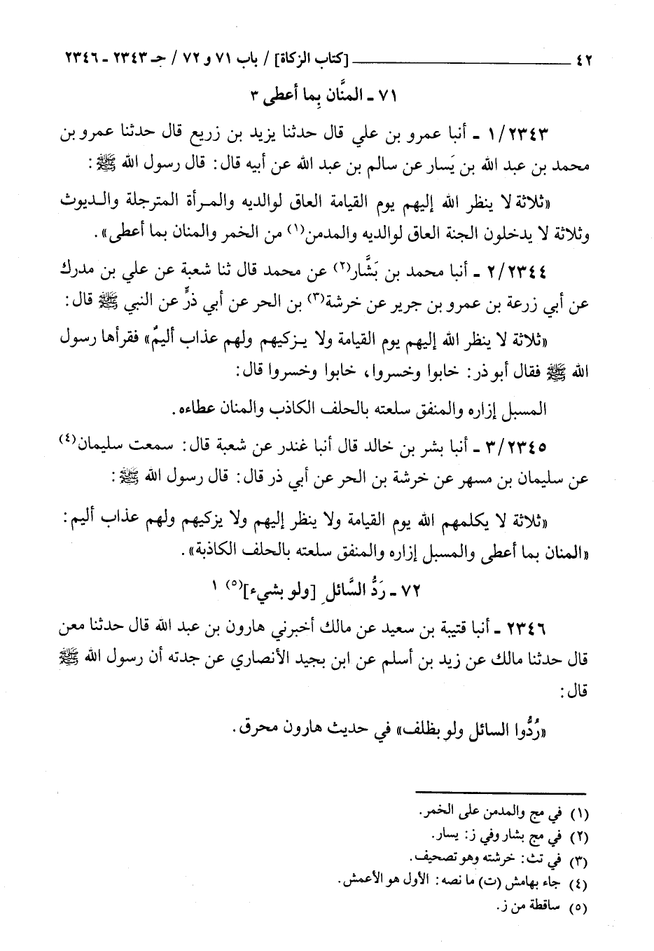 2345 - أنبأ بشر بن خالد قال أنبأ غندر عن شعبة قال سمعت سليمان عن سليمان بن مسهر عن خرشة بن الحر عن أبي ذر قال قال رسول الله صلى الله عليه و سلم : ثلاثة لا يكلمهم الله يوم القيامة ولا ينظر إليهم ولا يزكيهم ولهم عذاب أليم المنان بما أعطى والمسبل إزاره والمنفق سلعته بالحلف الكاذبة
