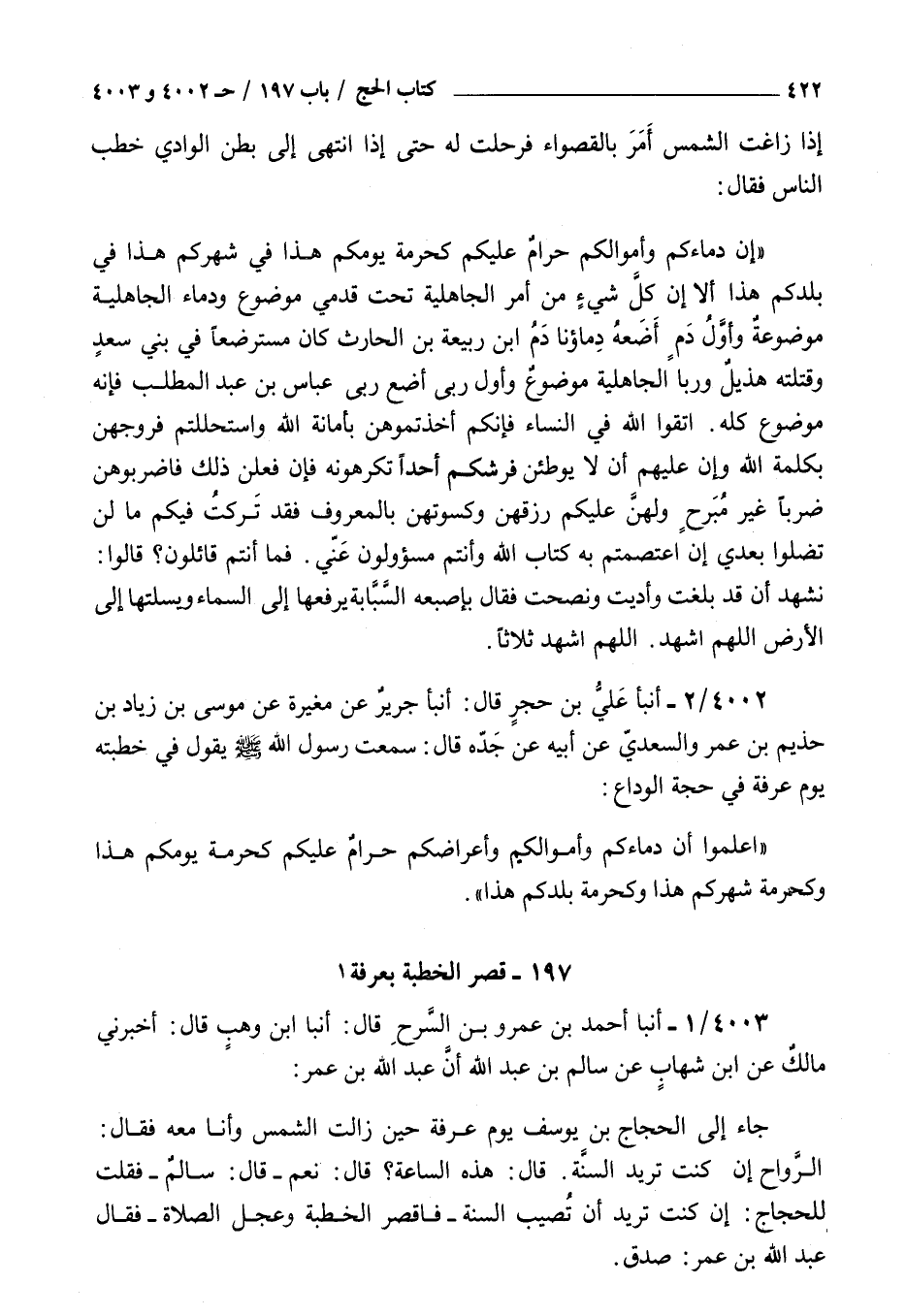 4003 - أنبأ أحمد بن عمرو بن السرح قال أنبأ بن وهب قال أخبرني مالك عن بن شهاب عن سالم بن عبد الله : أن عبد الله بن عمر جاء إلى الحجاج بن يوسف يوم عرفة حين زالت الشمس وأنا معه فقال الرواح إن كنت تريد السنة قال هذه الساعة قال نعم قال سالم فقلت للحجاج إن كنت تريد أن تصيب السنة فاقصر الخطبة وعجل الصلاة فقال عبد الله بن عمر صدق
