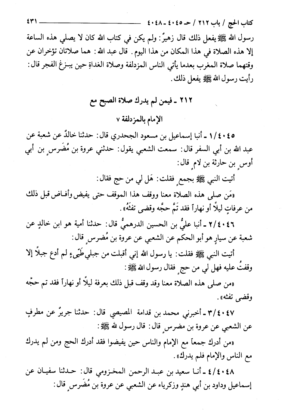 4047 - أخبرني محمد بن قدامة المصيصي قال حدثنا جرير عن مطرف عن الشعبي عن عروة بن مضرس قال قال رسول الله صلى الله عليه و سلم : من أدرك جمعا مع الإمام والناس حين يفيضوا فقد أدرك الحج ومن لم يدرك مع الناس والإمام فلم يدرك