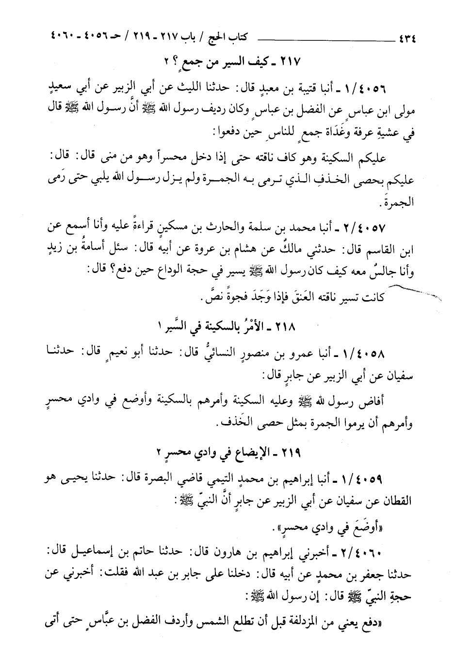 4058 - أنبأ عمرو بن منصور النسائي قال حدثنا أبو نعيم قال حدثنا سفيان عن أبي الزبير عن جابر قال : أفاض رسول الله صلى الله عليه و سلم وعليه السكينة وأمرهم بالسكينة وأوضع في وادي محسر وأمرهم أن يرموا الجمرة مثل حصى الخذف