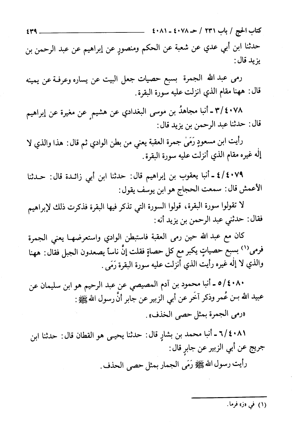 4078 - أنبأ مجاهد بن موسى البغدادي عن هشيم عن مغيرة عن إبراهيم قال حدثنا عبد الرحمن بن يزيد قال : رأيت بن مسعود رمى جمرة العقبة يعني من بطن الوادي ثم قال هذا والذي لا إله غيره مقام الذي أنزلت عليه سورة البقرة