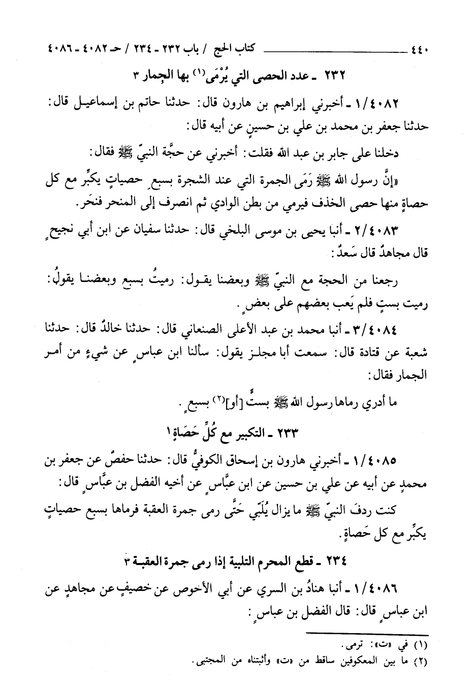 4083 - أنبأ يحيى بن موسى البلخي قال حدثنا سفيان عن بن أبي نجيح قال مجاهد قال سعد : رجعنا من الحجة مع النبي صلى الله عليه و سلم وبعضنا يقول رميت بسبع وبعضنا يقول رميت بست فلم يعب بعضهم على بعض