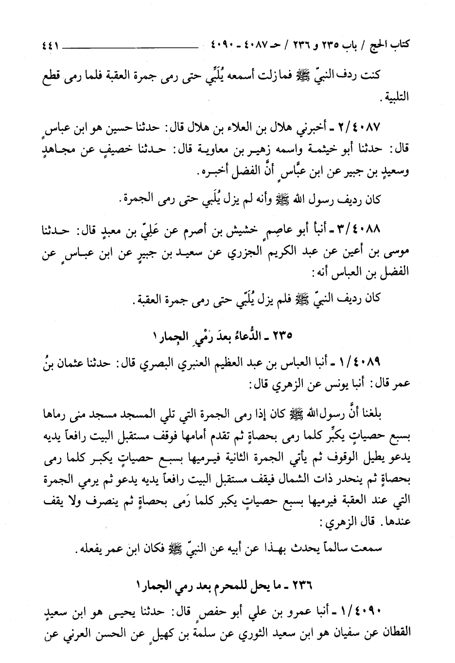 4088 - أنبأ أبو عاصم خشيش بن أصرم عن علي بن معبد قال حدثنا موسى بن أعين عن عبد الكريم الجزري عن سعيد بن جبير عن بن عباس عن الفضل بن العباس أنه : كان رديف النبي صلى الله عليه و سلم فلم يزل يلبي حتى رمى جمرة العقبة