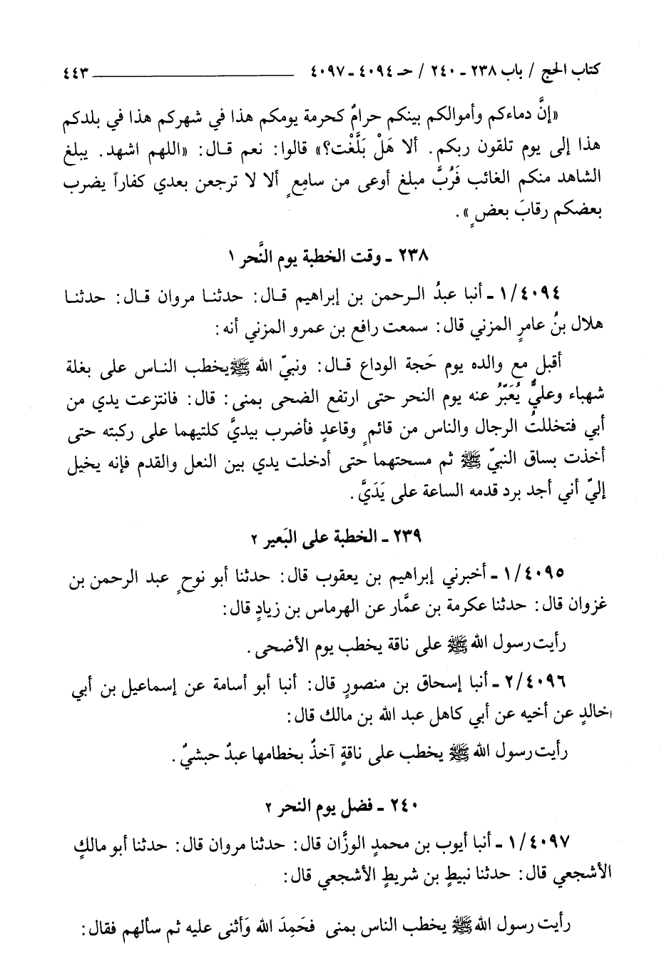 4097 - أنبأ أيوب بن محمد الوزان قال حدثنا مروان قال حدثنا أبو مالك الأشجعي قال حدثنا نبيط بن شريط الأشجعي قال : رأيت رسول الله صلى الله عليه و سلم يخطب الناس بمنى فحمد الله وأثنى عليه ثم سألهم فقال أي يوم أحرم قالوا هذا اليوم قال فأي بلد أحرم قالوا هذا البلد قال فأي شهر أحرم قالوا هذا الشهر قل فإن دماءكم وأموالكم عليكم حرام كحرمة هذا اليوم وحرمة هذا الشهر وحرمة هذا البلد اللهم هل بلغت قالوا نعم قال اللهم اشهد