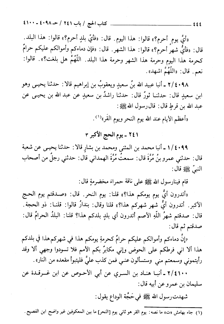 4099 - أنبأ محمد بن المثنى ومحمد بن بشار قالا حدثنا يحيى عن شعبة قال حدثني عمرو بن مرة قال سمعت مرة الهمداني قال حدثني رجل من أصحاب النبي صلى الله عليه و سلم قال : قام فينا رسول الله صلى الله عليه و سلم على ناقة حمراء مخضرمة قال أتدرون أي يوم يومكم هذا قلنا يوم النحر قال صدقتم يوم الحج الأكبر أتدرون أي شهر شهركم هذا قلنا وقال بندار قالوا قلنا ذو الحجة قال صدقتم شهر الله الأصم أتدرون أي بلد بلدكم هذا قلنا البلد الحرام قال صدقتم ثم قال إن دماءكم وأموالكم عليكم حرام كحرمة يومكم هذا في شهركم هذا في بلدكم هذا ألا إني فرطكم على الحوض وإني مكابر بكم الأمم فلا تسودوا وجهي ألا وقد رأيتموني وسمعتم مني وستسألون عني فمن كذب علي فليتبوأ مقعده من النار