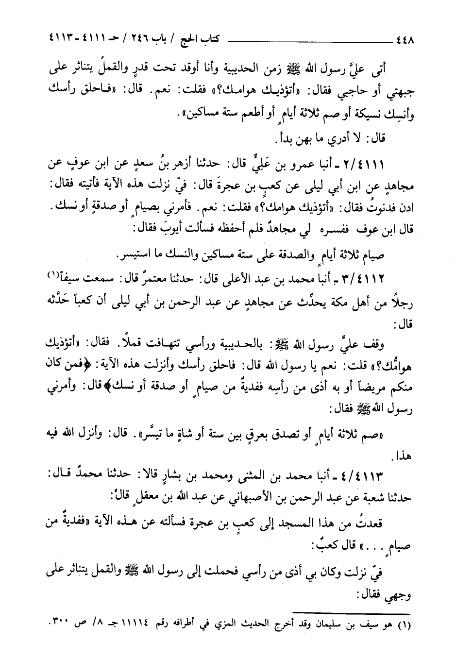 4112 - أنبأ محمد بن عبد الأعلى قال حدثنا معتمر قال سمعت سيفا رجلا من أهل مكة يحدث عن مجاهد عن عبد الرحمن بن أبي ليلى أن كعبا حدثه قال : وقف علي رسول الله صلى الله عليه و سلم بالحديبية ورأسي تتهافت قملا فقال أتؤذيك هوامك قلت نعم يا رسول الله قال فاحلق رأسك وأنزلت هذه الآية { فمن كان منكم مريضا أو به أذى من رأسك ففدية من صيام أو صدقة أو نسك } قال وأمرني رسول الله صلى الله عليه و سلم فقال صم ثلاثة أيام أو تصدق بعرق بين ستة أو شاة ما تيسر قال وأنزل الله فيه هذا