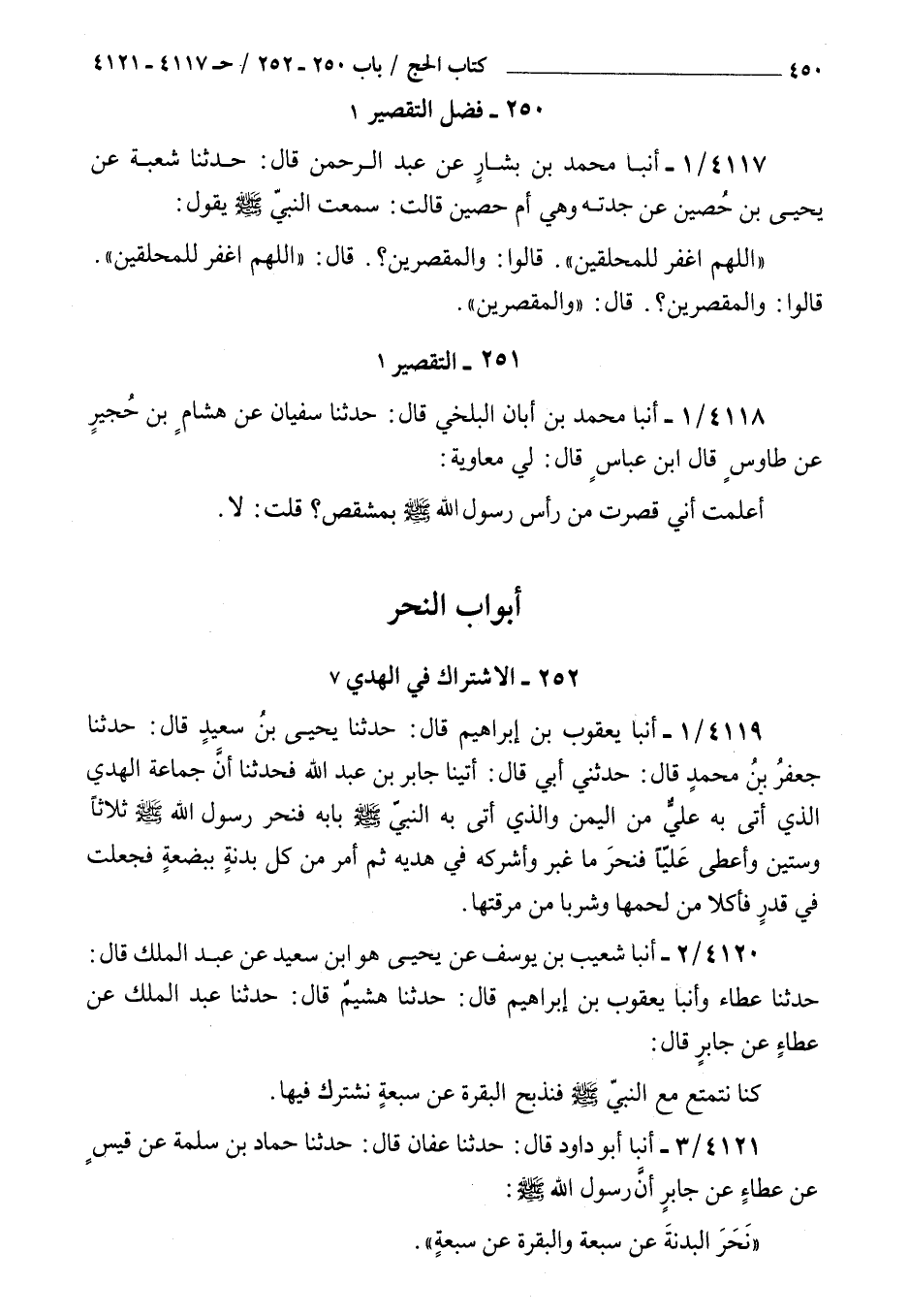 4120 - أنبأ شعيب بن يوسف عن يحيى هو بن سعيد عن عبد الملك قال حدثنا عطاء وأنبأ يعقوب بن إبراهيم قال حدثنا هشيم قال حدثنا عبد الملك عن عطاء عن جابر قال : كنا نتمتع مع النبي صلى الله عليه و سلم فنذبح البقرة عن سبعة نشترك فيها